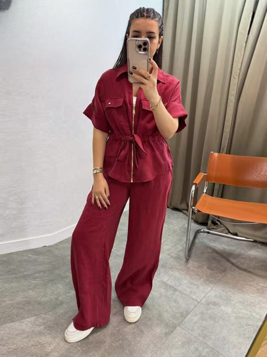 Ensemble Chemise à Manches Courtes Boutonnée et Pantalon Femme