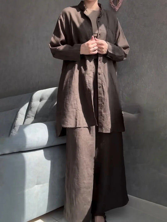 Ensemble deux pièces décontracté en coton et lin à col montant