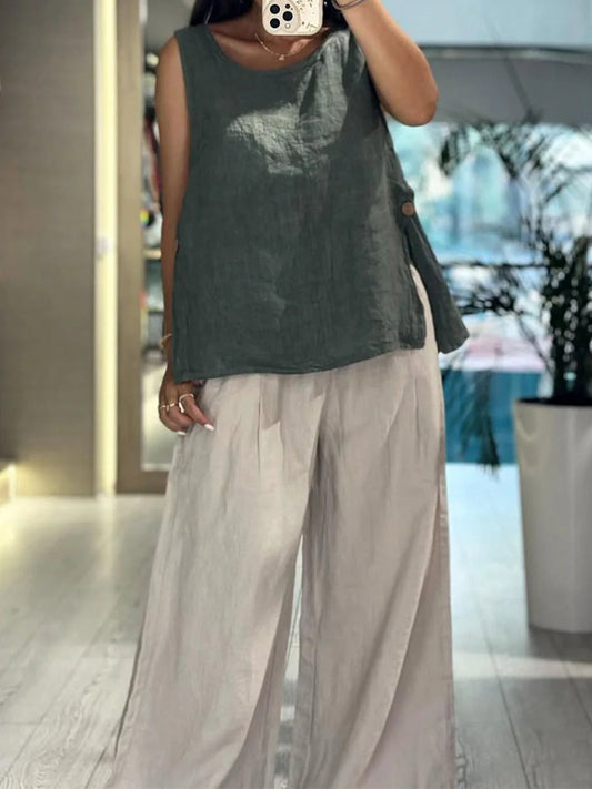 Ensemble deux pièces décontracté sans manches en coton et lin