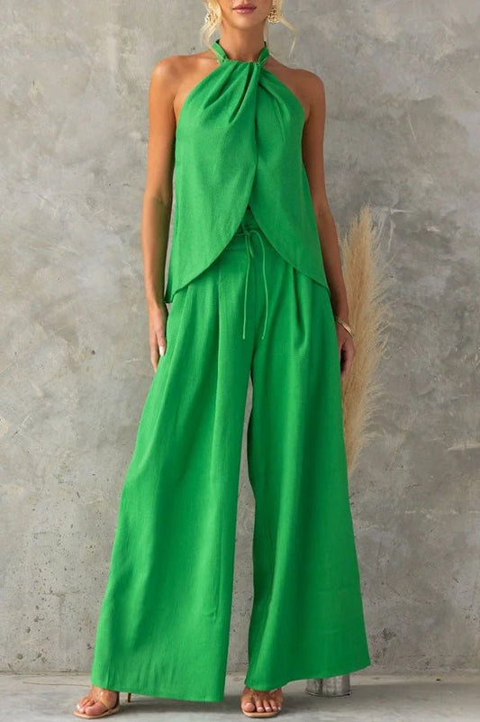 Ensemble haut fendu et pantalon taille haute en lin mélangé
