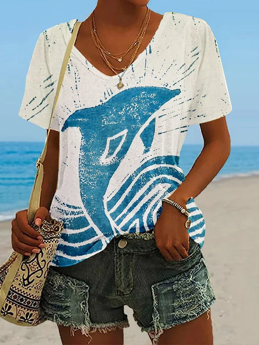 T-shirt à col rond avec motif artistique de dauphin pour femmes