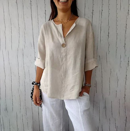 T-shirt confortable pour femme en lin et coton avec encolure en V