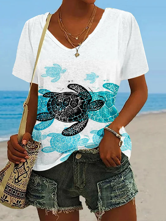T-shirt Femme à Col en V avec Motif Tortues Marines Ludiques