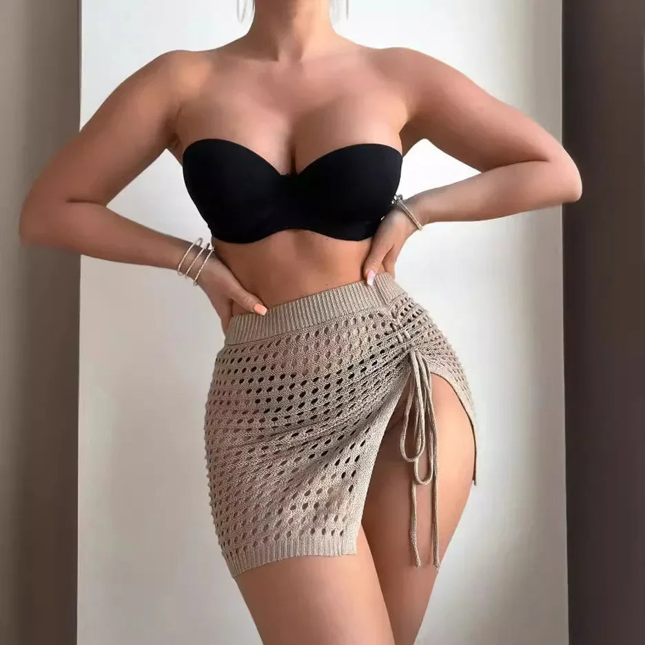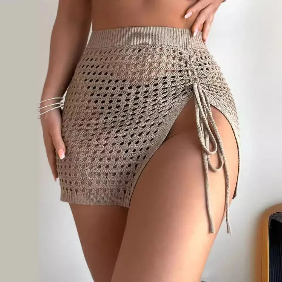 Ce cache-maillot court en tricot ajouré se superpose avec élégance à vos maillots de bain. Son cordon froncé sur le côté et sa large ceinture côtelée permettent un ajustement personnalisé tout en mettant en valeur la silhouette.