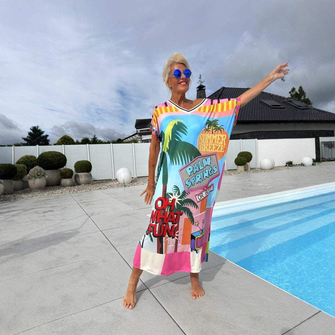 Avec ses manches courtes aériennes, son tissu fluide et ses imprimés inspirés de la mer, du soleil et de la nature, cette robe maxi est un véritable hymne à l’été. Elle associe confort absolu et style estival pour vous accompagner aussi bien à la plage qu’en promenade. Disponible jusqu’au 5XL, elle célèbre toutes les silhouettes avec charme et douceur.