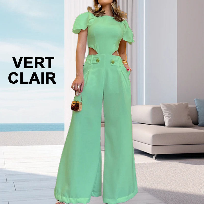 Costume pantalon à jambes larges et taille creuse pour femme, couleur unie