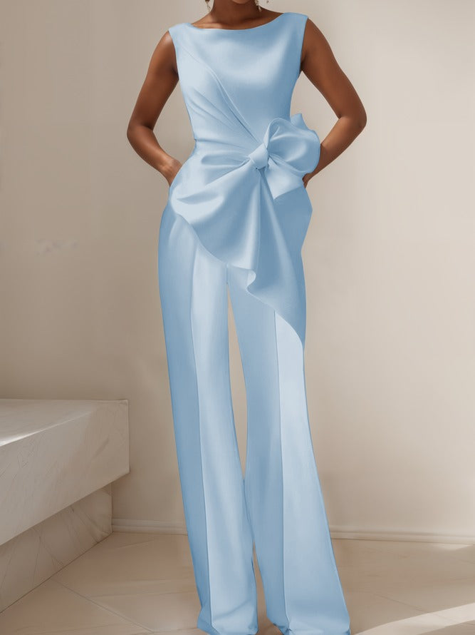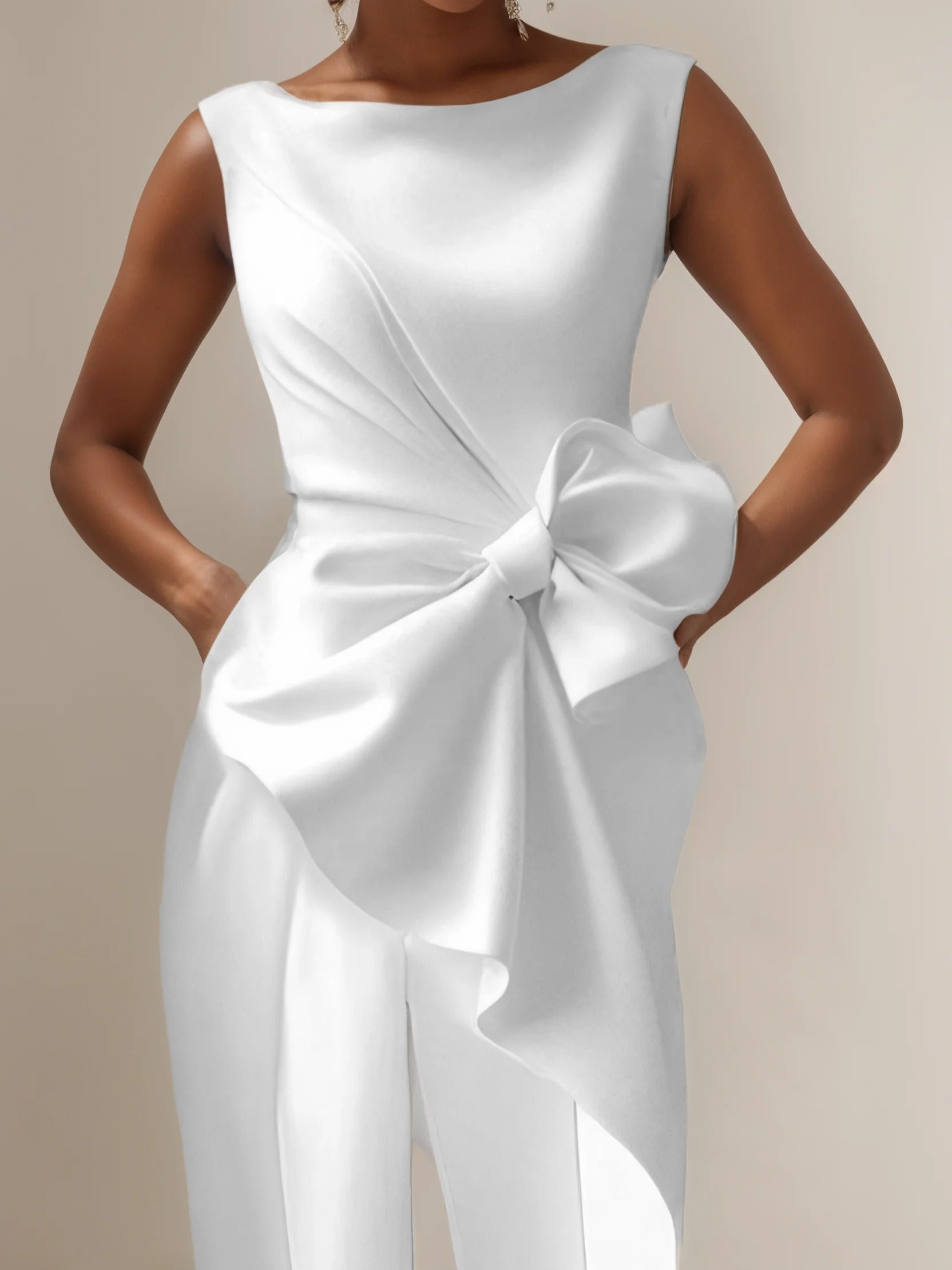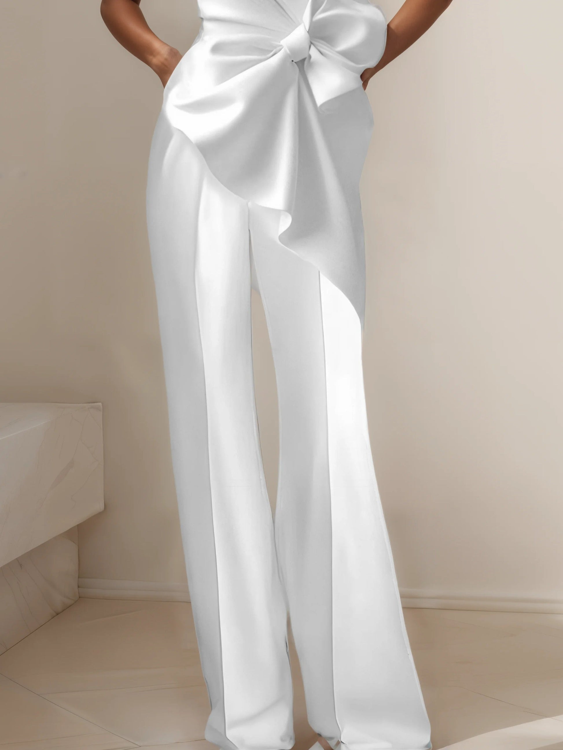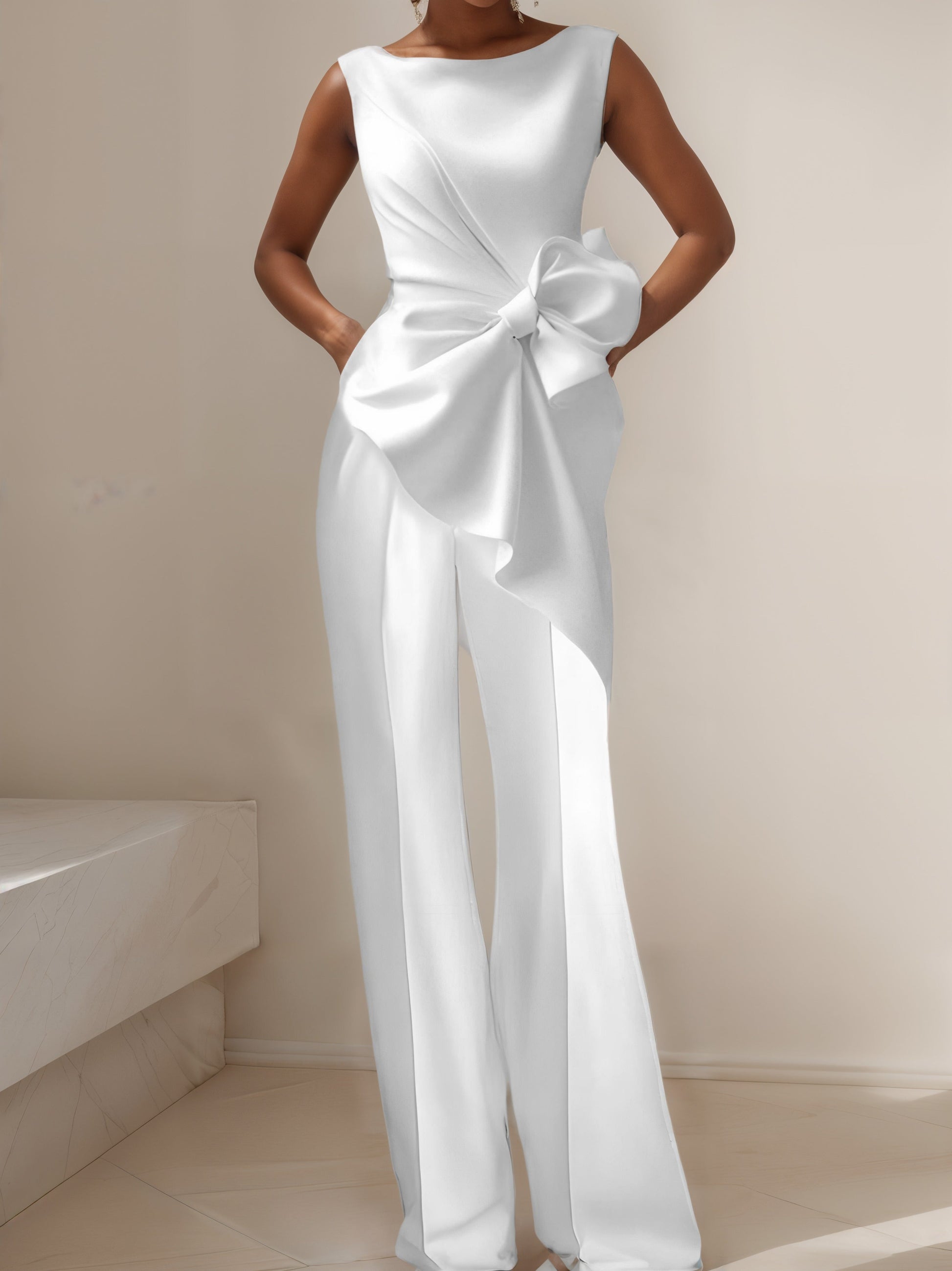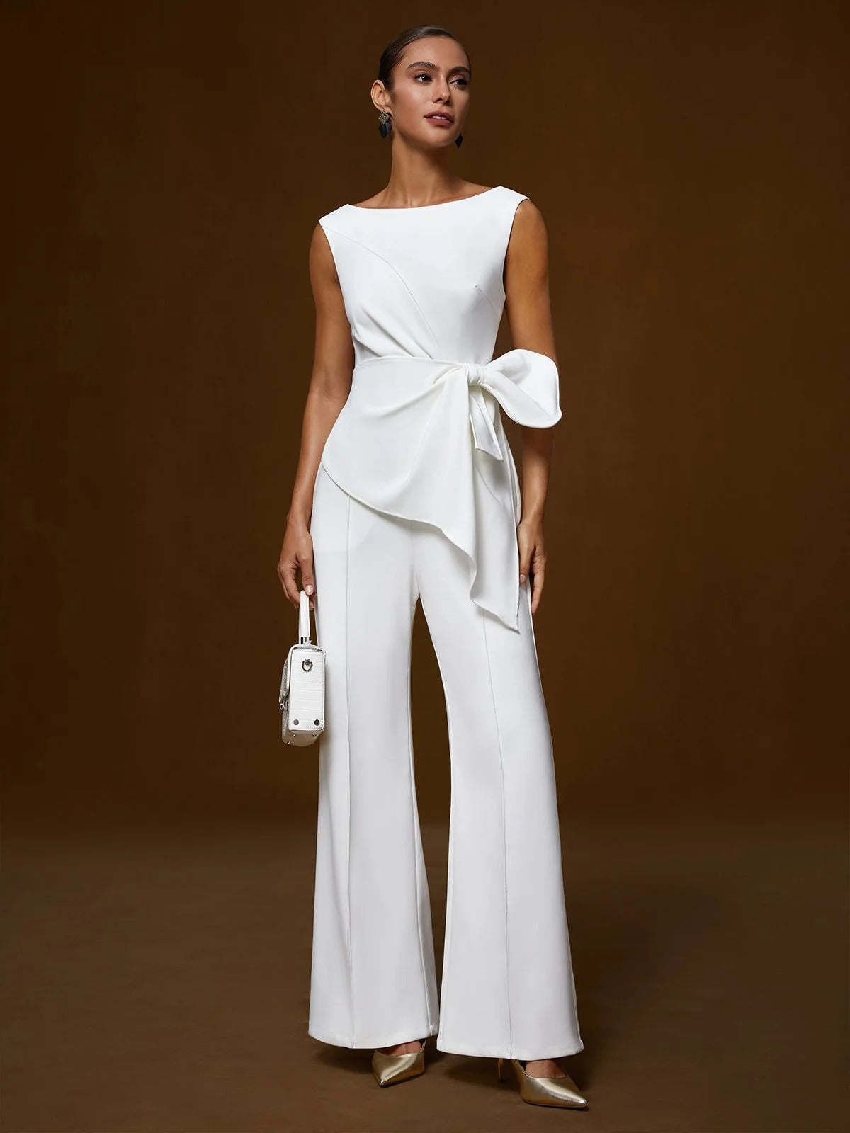 Élégante et fluide, cette combinaison blanche à col bateau et manches longues est idéale pour les occasions spéciales ou les sorties chic. Sa coupe à jambes larges allonge la silhouette, tandis que le nœud délicat à la taille souligne subtilement vos courbes. Une pièce sophistiquée qui incarne à la fois modernité et grâce.