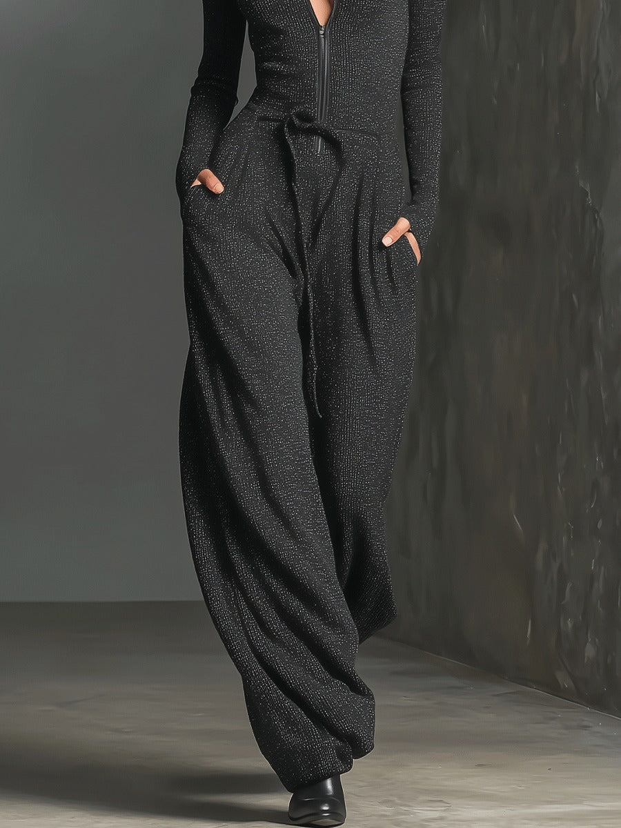 Une élégante combinaison avec une touche de paillettes, dotée d'une fermeture éclair sur le devant et d'une coupe ample et décontractée. Confectionnée dans un tissu extensible et drapé pour un look chic et confortable.