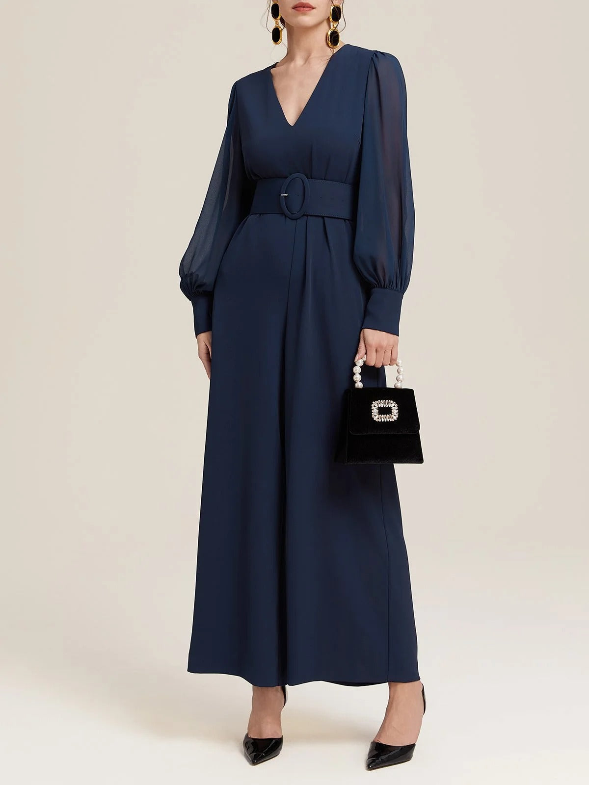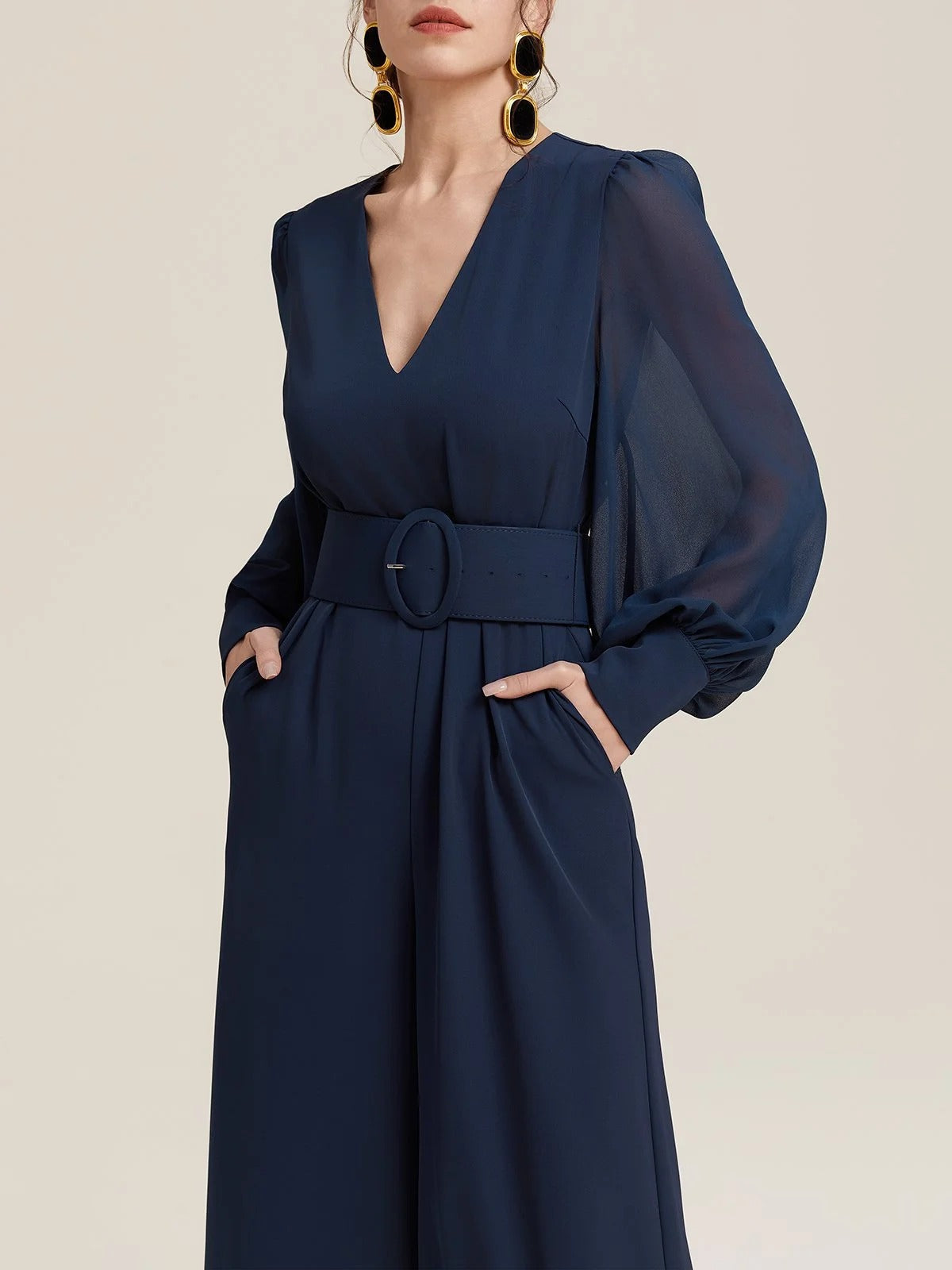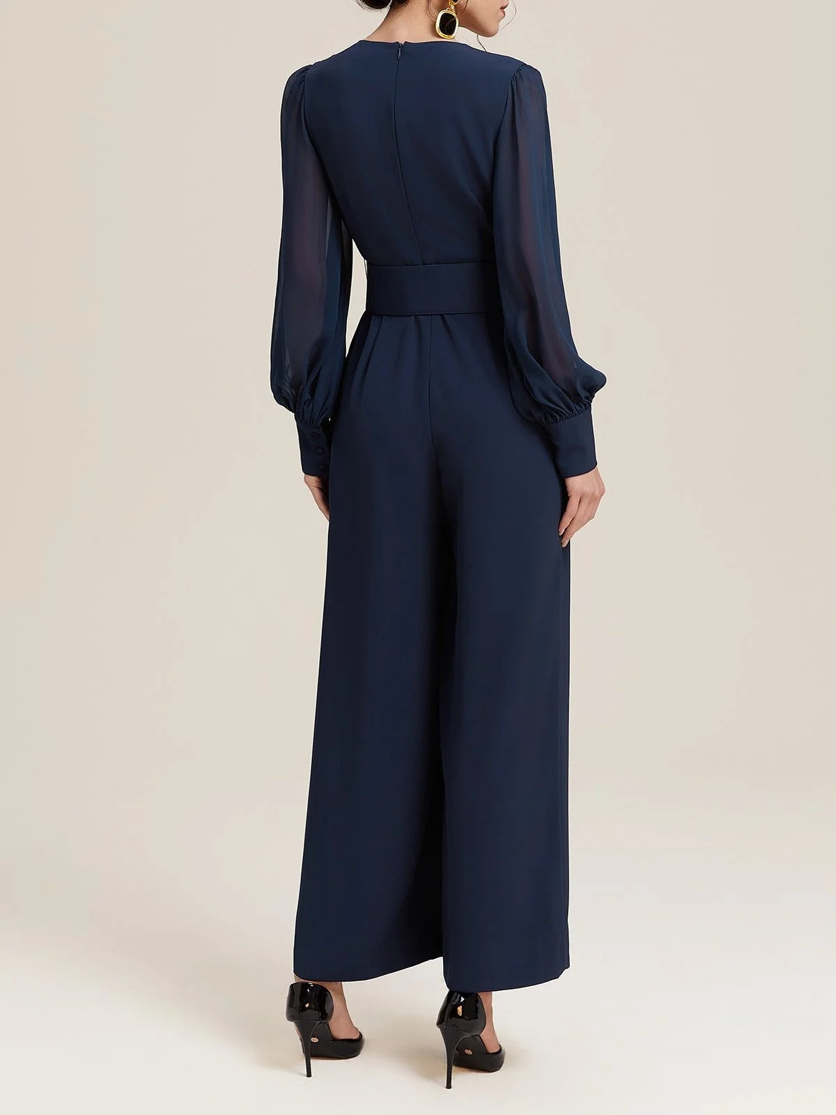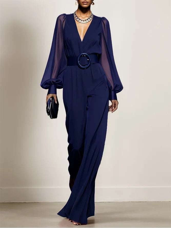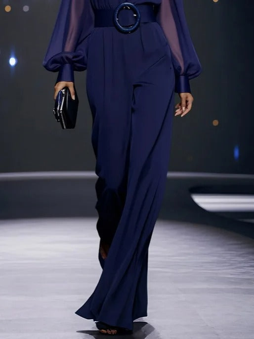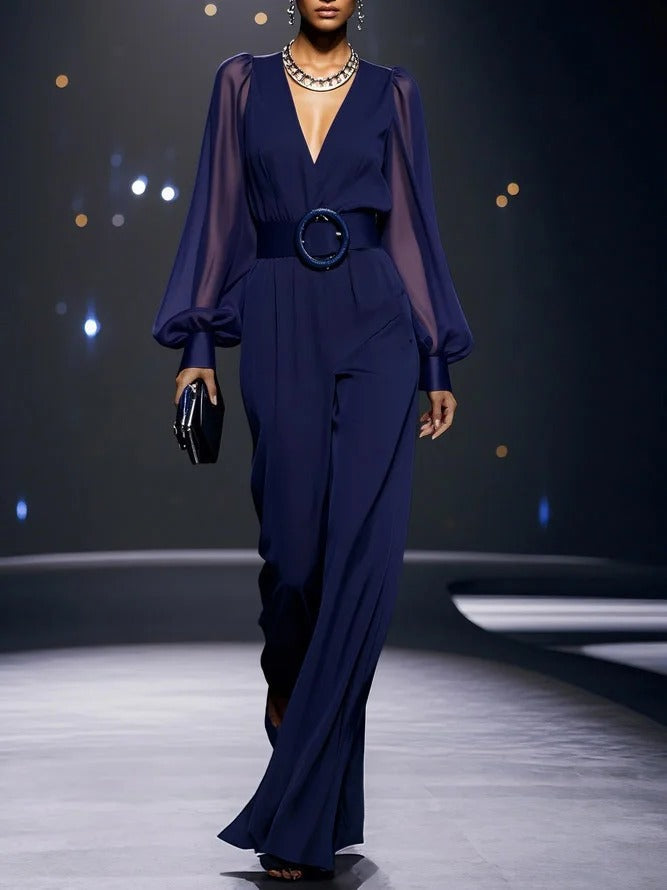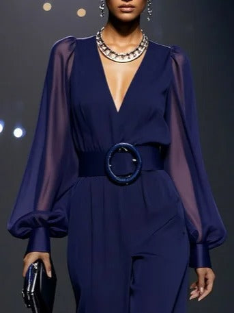 Cette combinaison en mousseline de soie bleu foncé allie fluidité et élégance dans une silhouette raffinée. Son col en V allonge visuellement la silhouette, tandis que les manches ballon ajoutent une touche de féminité aérienne. Parfaite pour les occasions spéciales ou les sorties estivales avec style.
