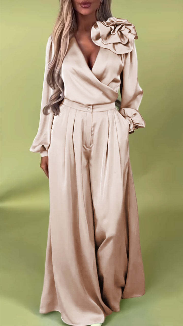 Conçu pour allier sophistication et modernité, ce costume deux pièces en satin offre une brillance subtile et un tombé fluide qui rehausse instantanément votre allure. Le haut à col en V souligne la silhouette avec élégance, tandis que le pantalon assorti complète l’ensemble pour une tenue chic et contemporaine.