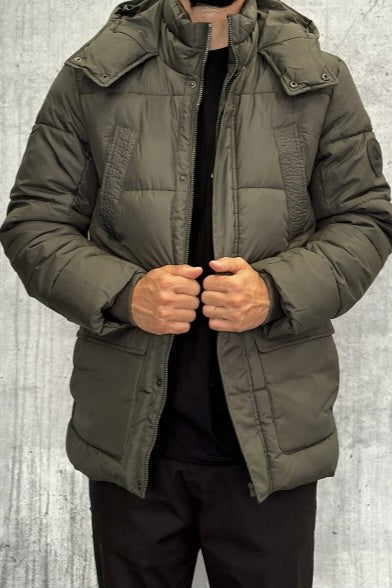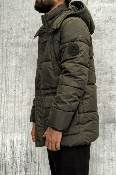 Cette veste bien isolée et dotée d'une capuche à col montant.