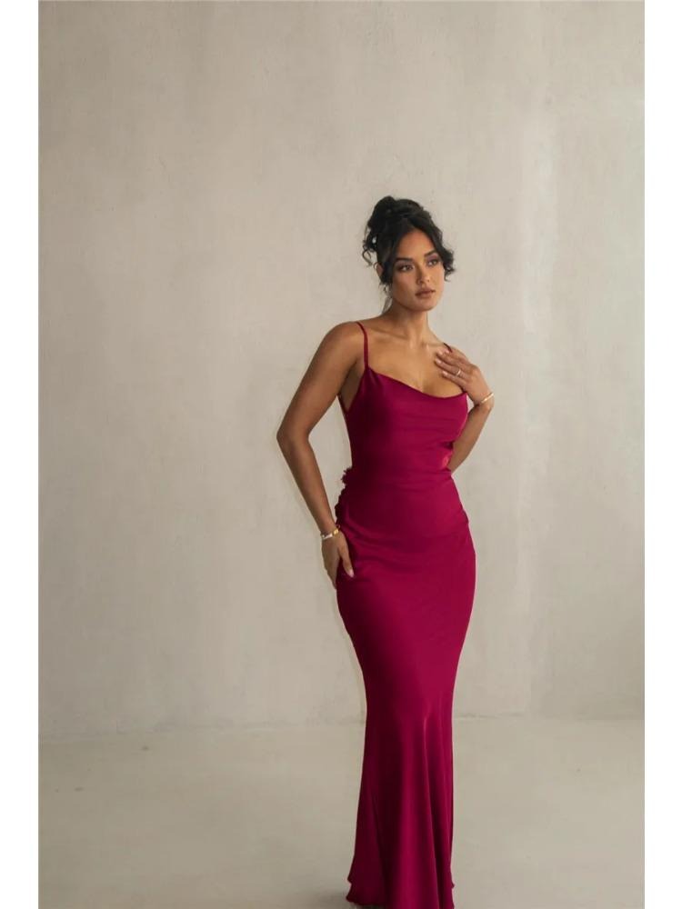 Cette robe longue en satin séduit par son tombé fluide, son décolleté drapé et ses fines bretelles délicates. Sa coupe ajustée allonge la silhouette avec élégance, tandis que le tissu satiné apporte un éclat subtil à chaque mouvement. Un style raffiné qui conjugue minimalisme et sensualité.
