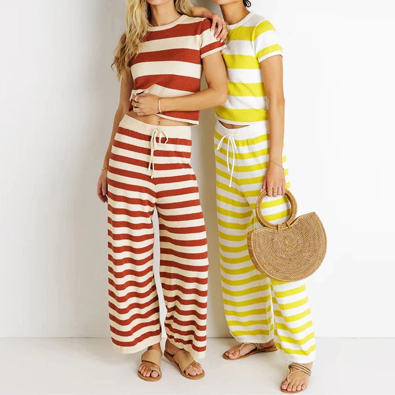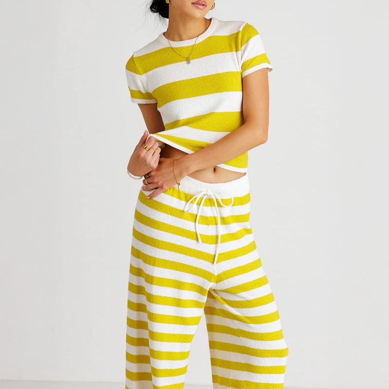 Pourquoi se fondre dans la masse quand on peut se démarquer ? L'ensemble 2 pièces rayé transforme votre tenue de tous les jours en une pièce de style affirmée : rayures audacieuses et confort absolu. Le haut ajusté à manches courtes flatte avec aisance, tandis que le pantalon large offre une élégance décontractée, resserré par un cordon de serrage à la taille pour un confort optimal.