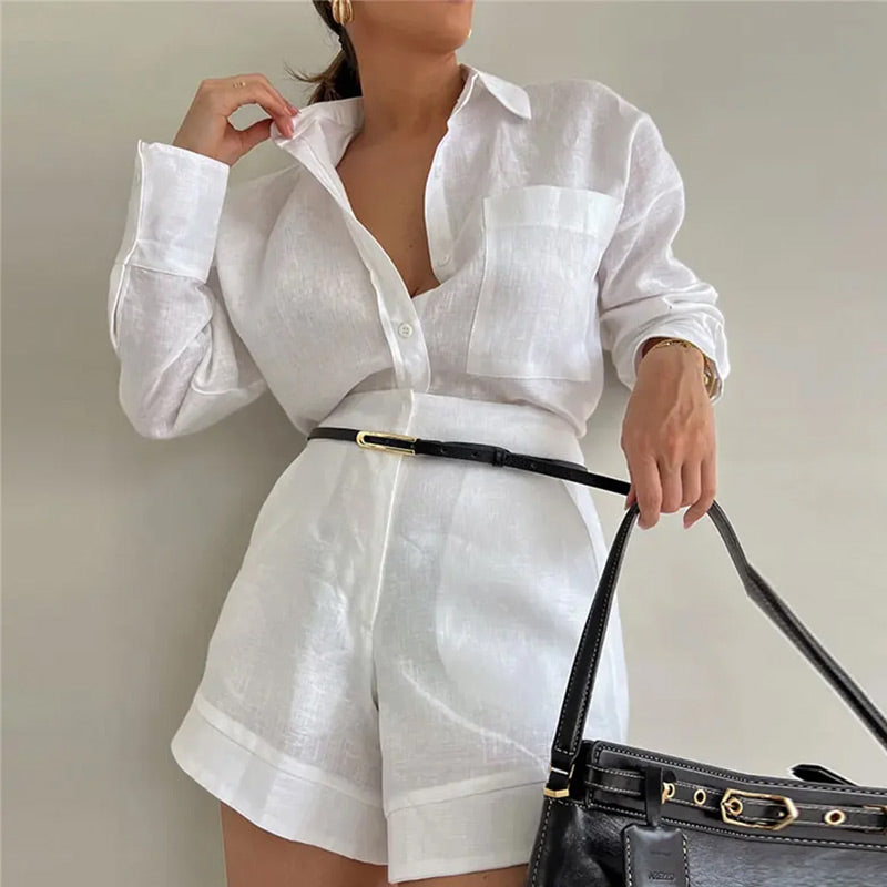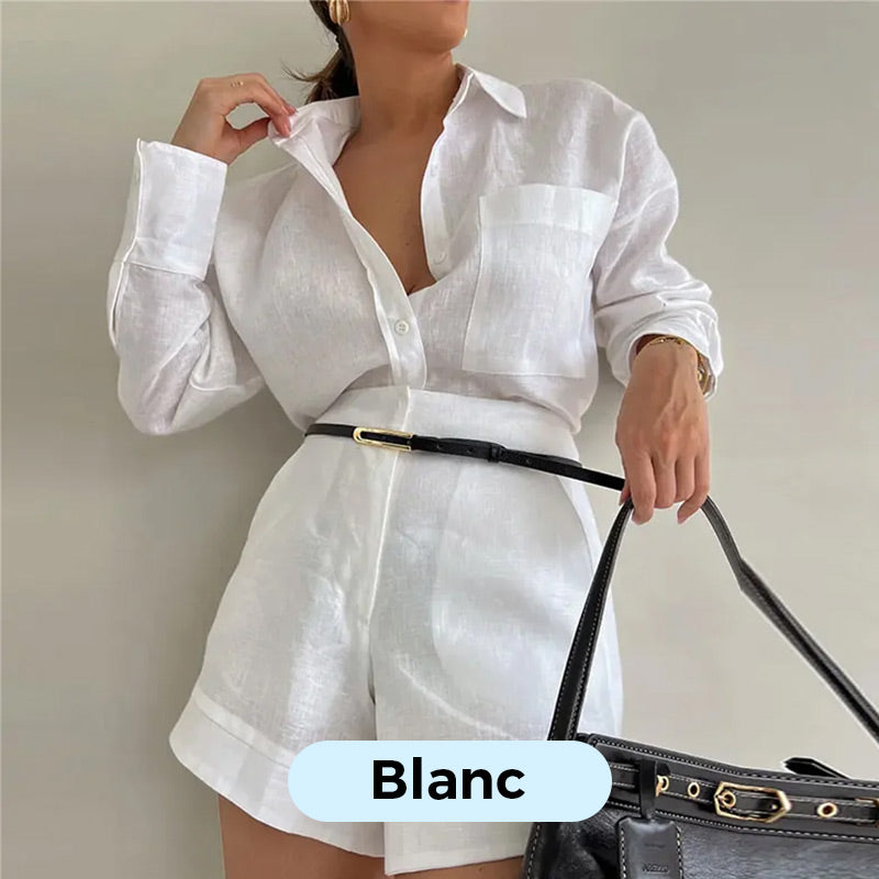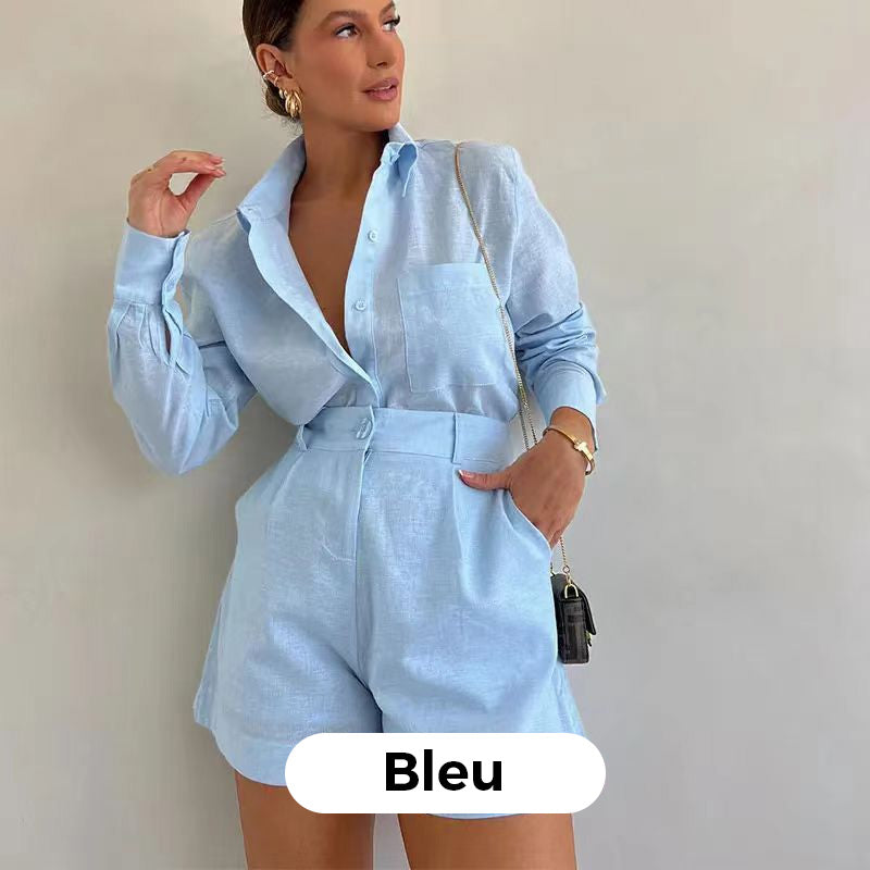 Ensemble 2 Pièces Décontracté : Chemise à Col à Revers et Shorts de Couleur Unie