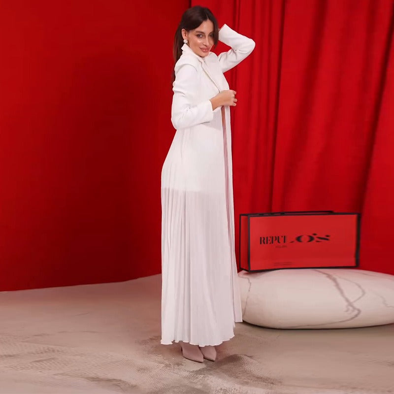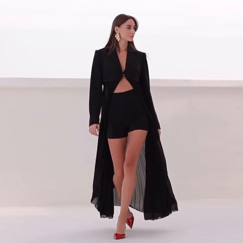 Plongez dans l'élégance contemporaine avec cet ensemble deux pièces au design audacieux. Parfait pour les femmes en quête de style et de modernité, il associe une blouse asymétrique à manches longues à un short taille haute flatteur.