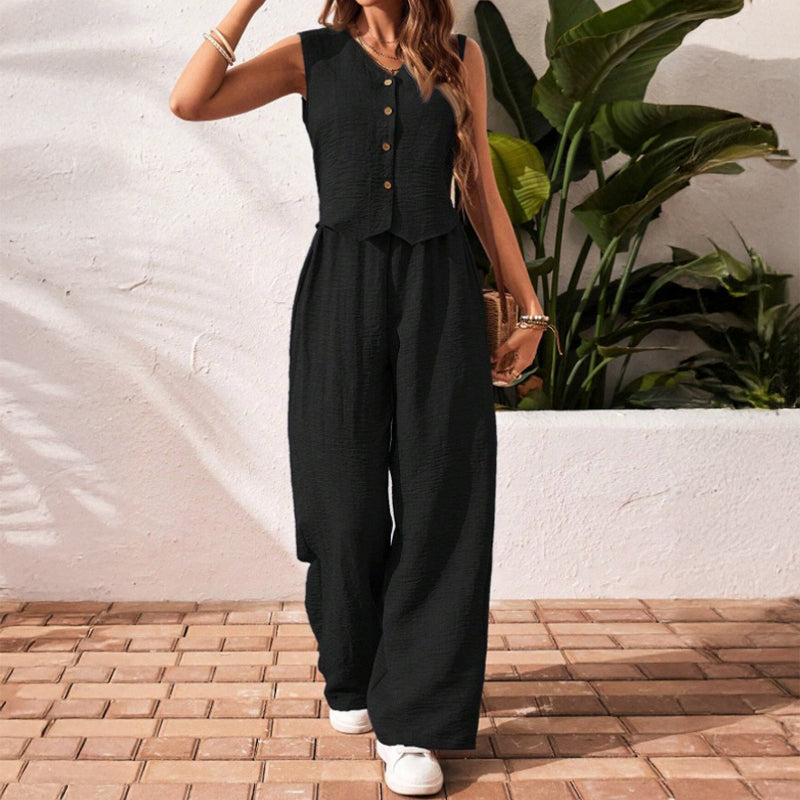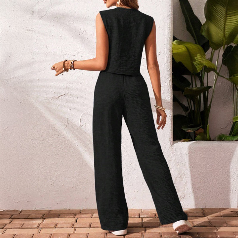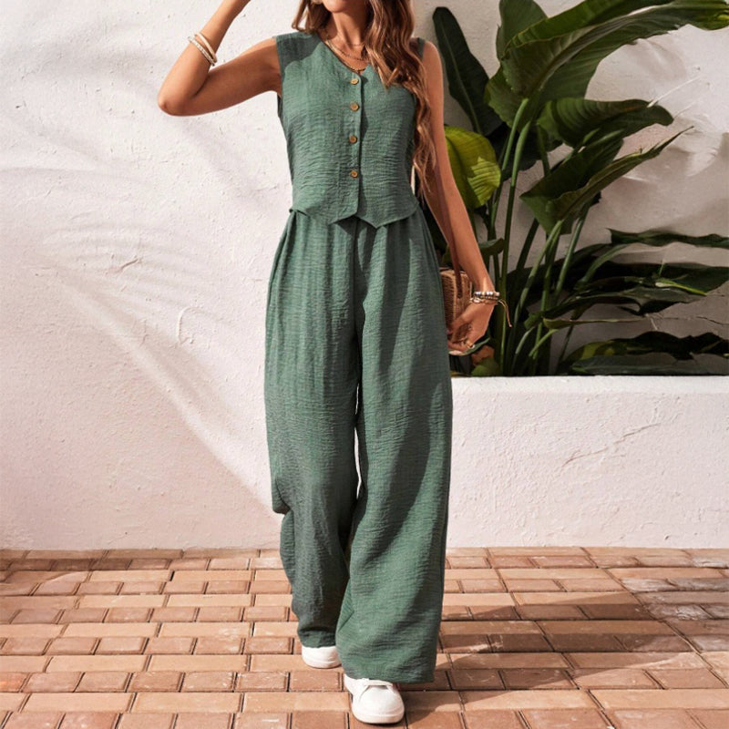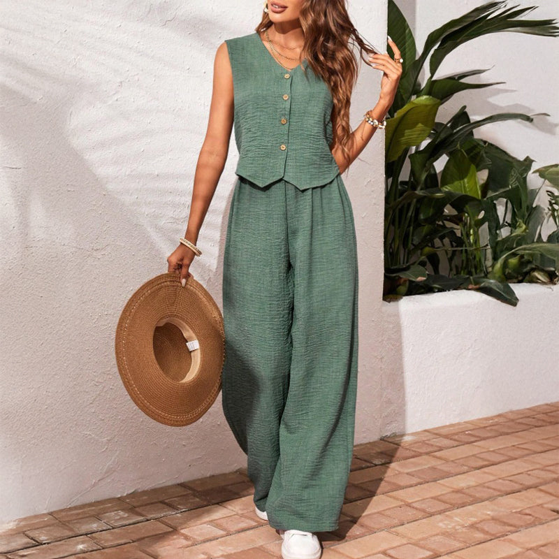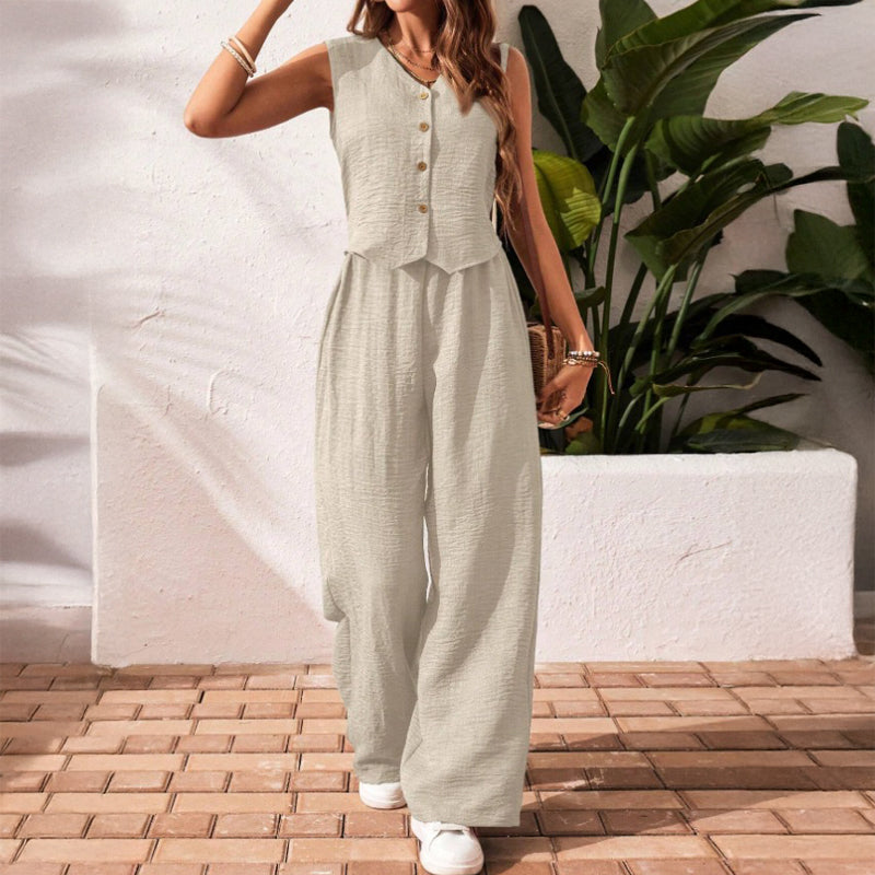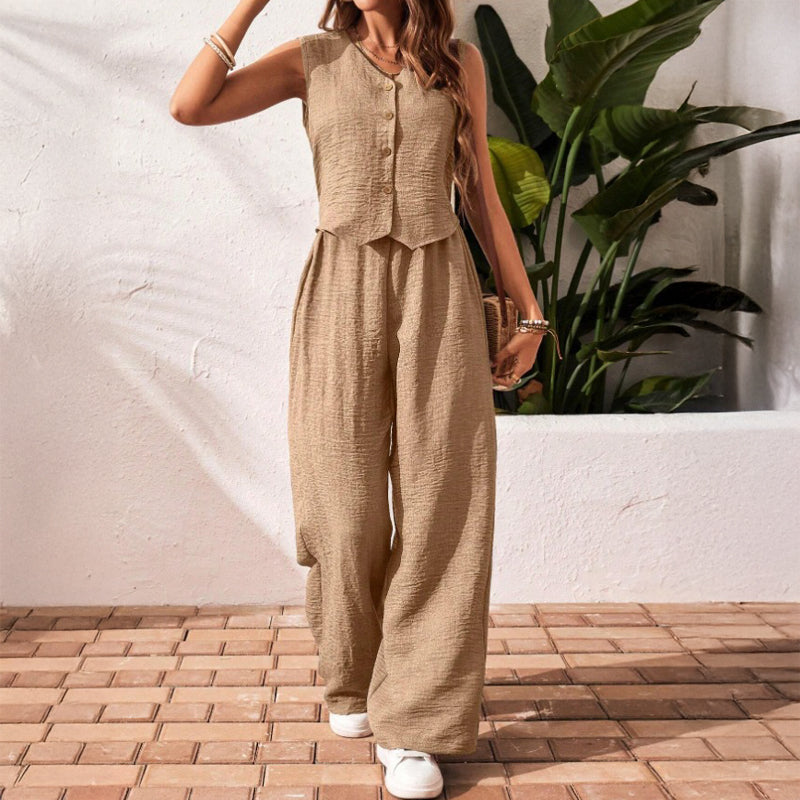 Cet ensemble deux pièces, composé d'un haut boutonné sans manches et d'un pantalon fluide à taille haute, est conçu pour les journées chaudes, les heures dorées et les promenades lentes et élégantes.