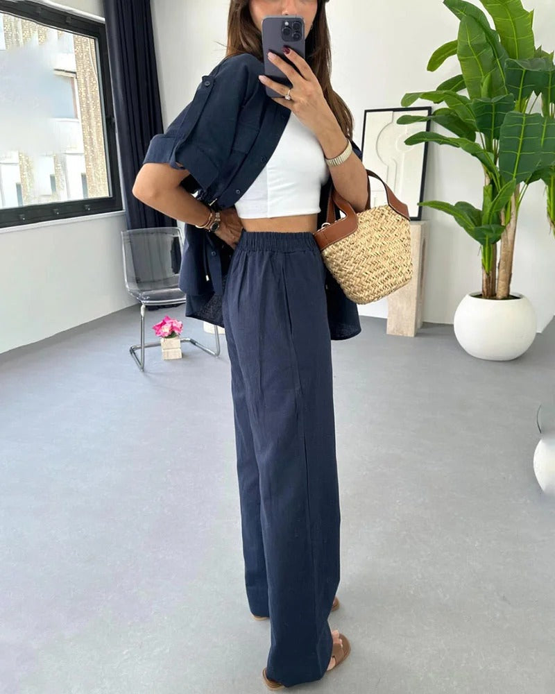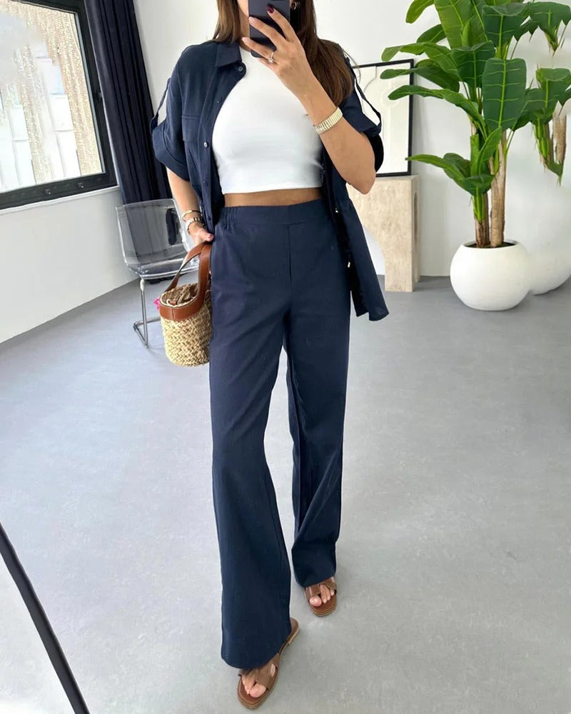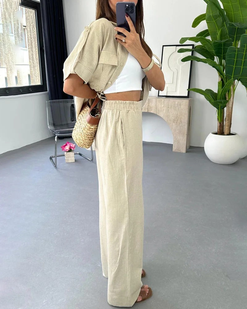 Un ensemble deux pièces léger et naturel, parfait pour la mi-saison. Il allie confort et style avec une coupe fluide et des finitions épurées, idéal pour les journées douces du printemps à l’été.