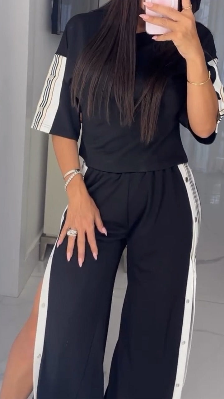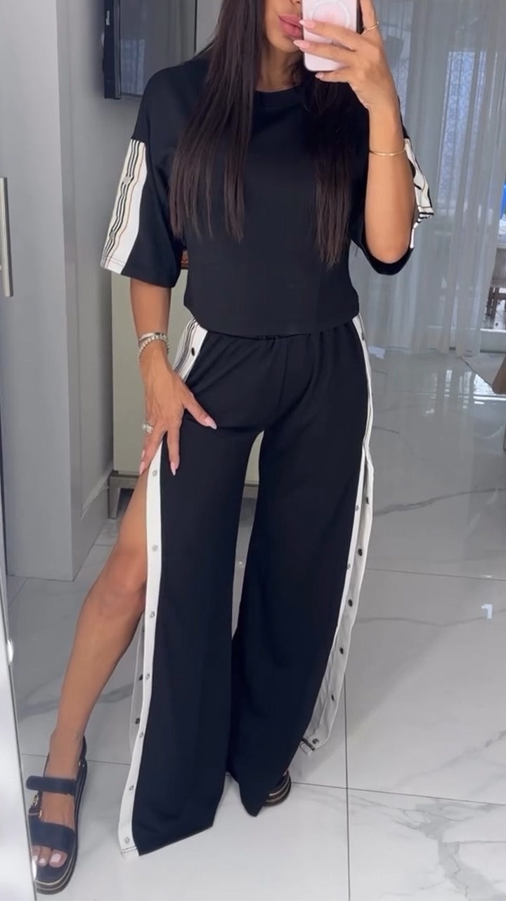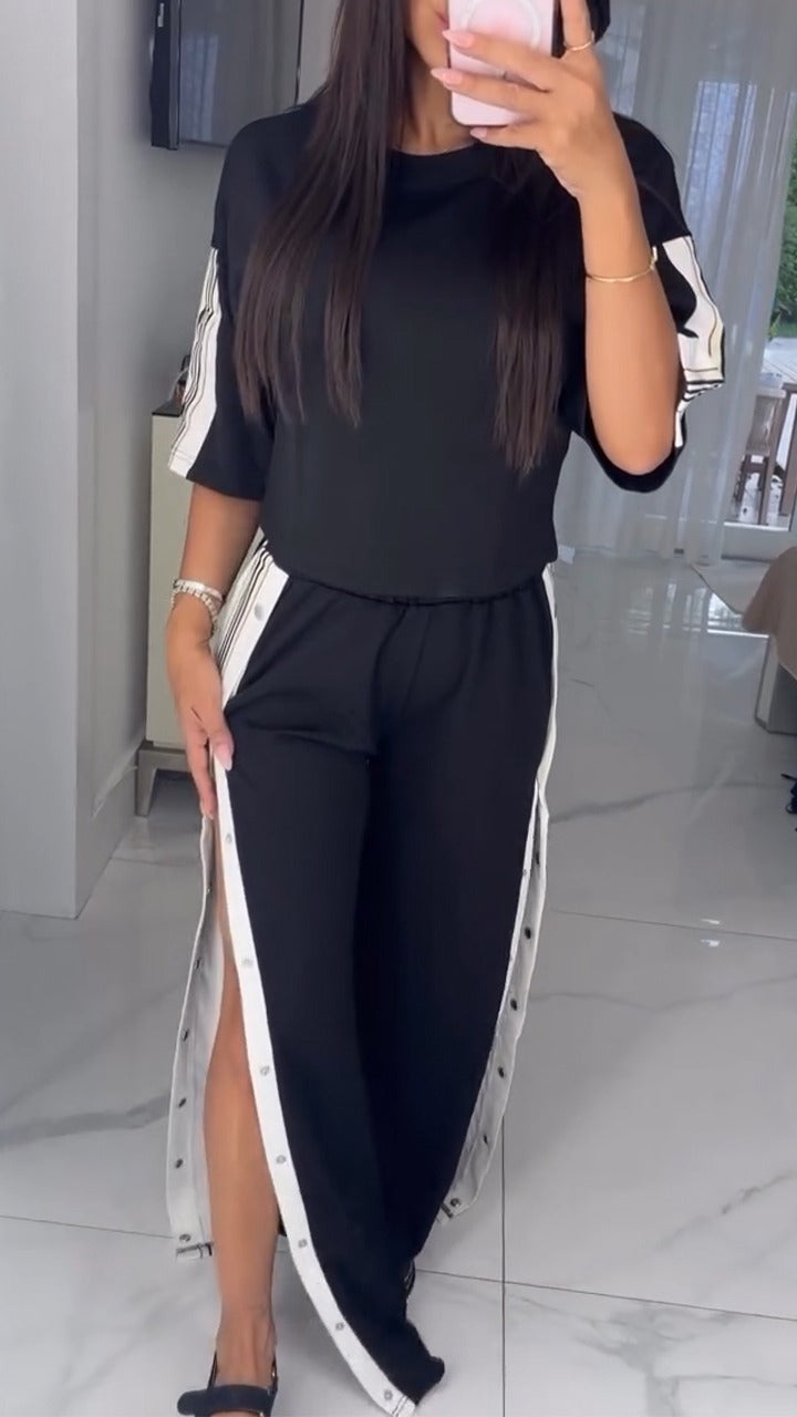 Un look moderne et confortable qui vous accompagne en toutes circonstances. Cet ensemble associe un haut simple à col rond et un pantalon à fente élégante, créant une silhouette décontractée mais raffinée. Parfait pour les journées de détente comme pour des sorties stylées, il allie confort et allure contemporaine.