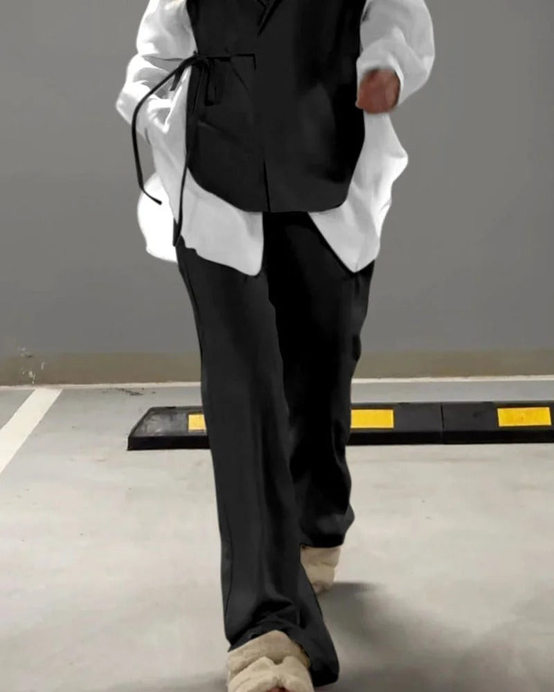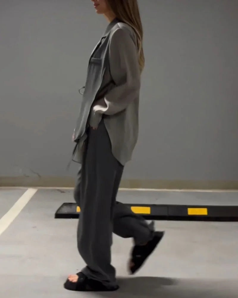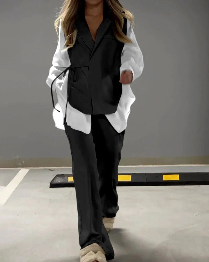Un look moderne avec cet ensemble fluide composé d'une chemise boutonnée à manches longues et d’un pantalon droit. Confectionné dans un tissu doux et aéré, il est idéal pour la mi-saison ou les journées estivales.