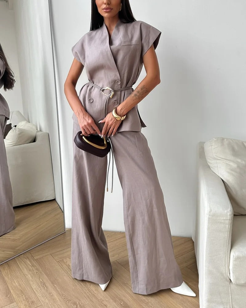 Ensemble deux pièces haut et pantalon en lin à double boutonnage