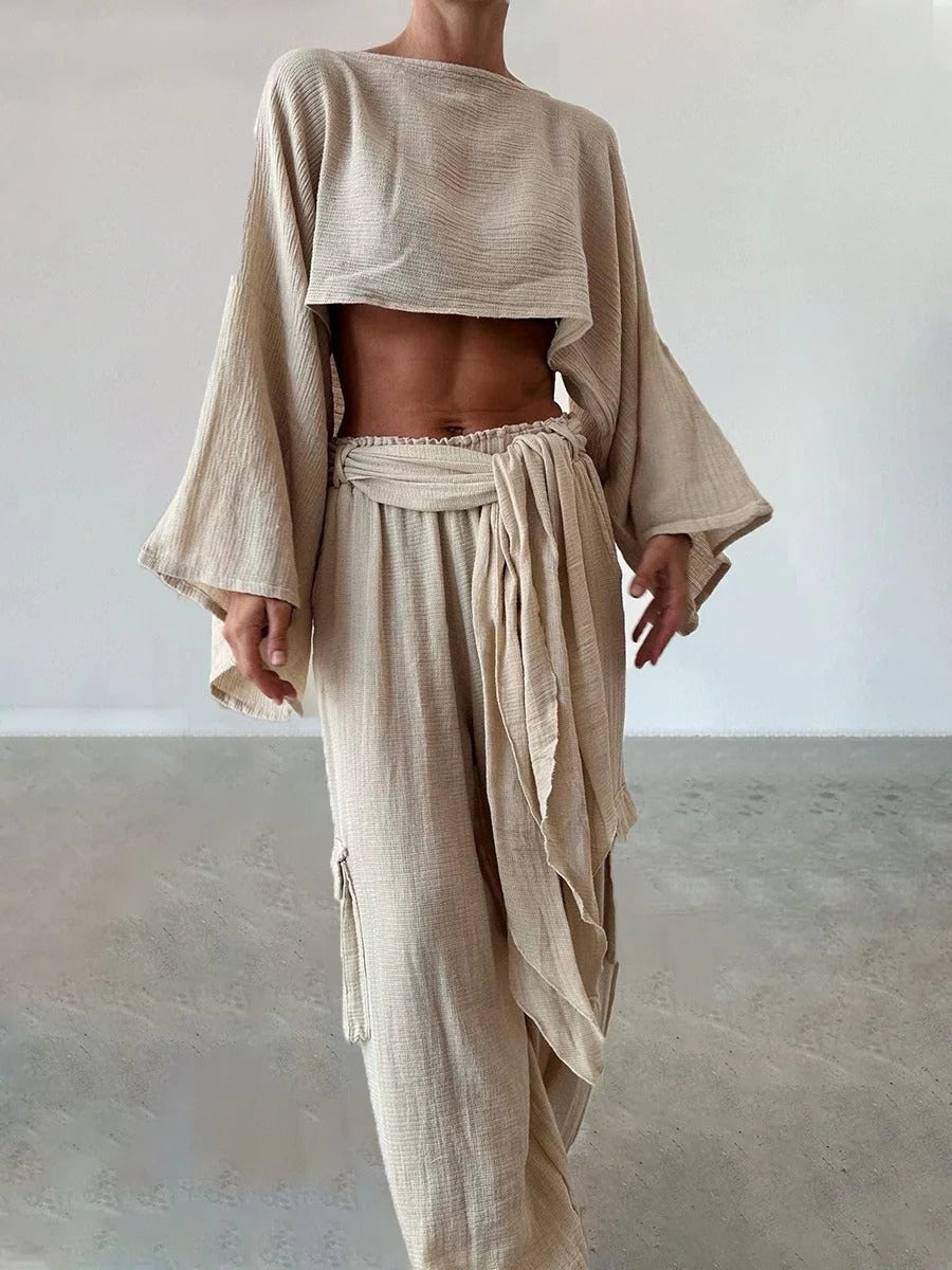 Cet ensemble deux pièces en coton et lin allie légèreté et simplicité pour un confort absolu au quotidien. Sa coupe ample sans taille marquée offre une grande liberté de mouvement tout en conservant une allure naturelle et élégante.