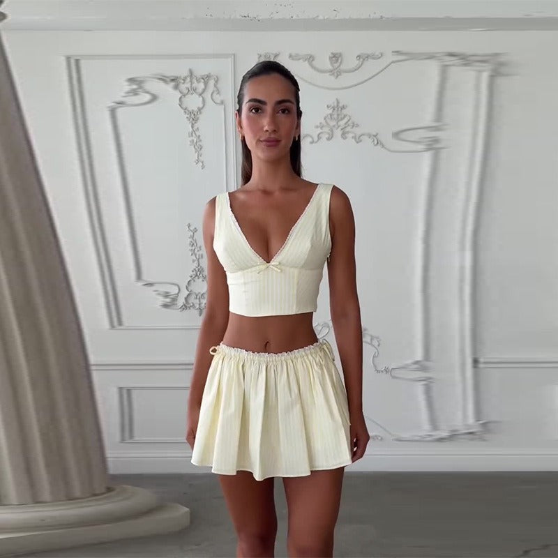 Optez pour un look audacieux et sophistiqué avec cet ensemble rayé alliant brassière et mini jupe style costume. La coupe ajustée met en valeur votre silhouette avec élégance, tandis que les rayures apportent une touche moderne et dynamique.