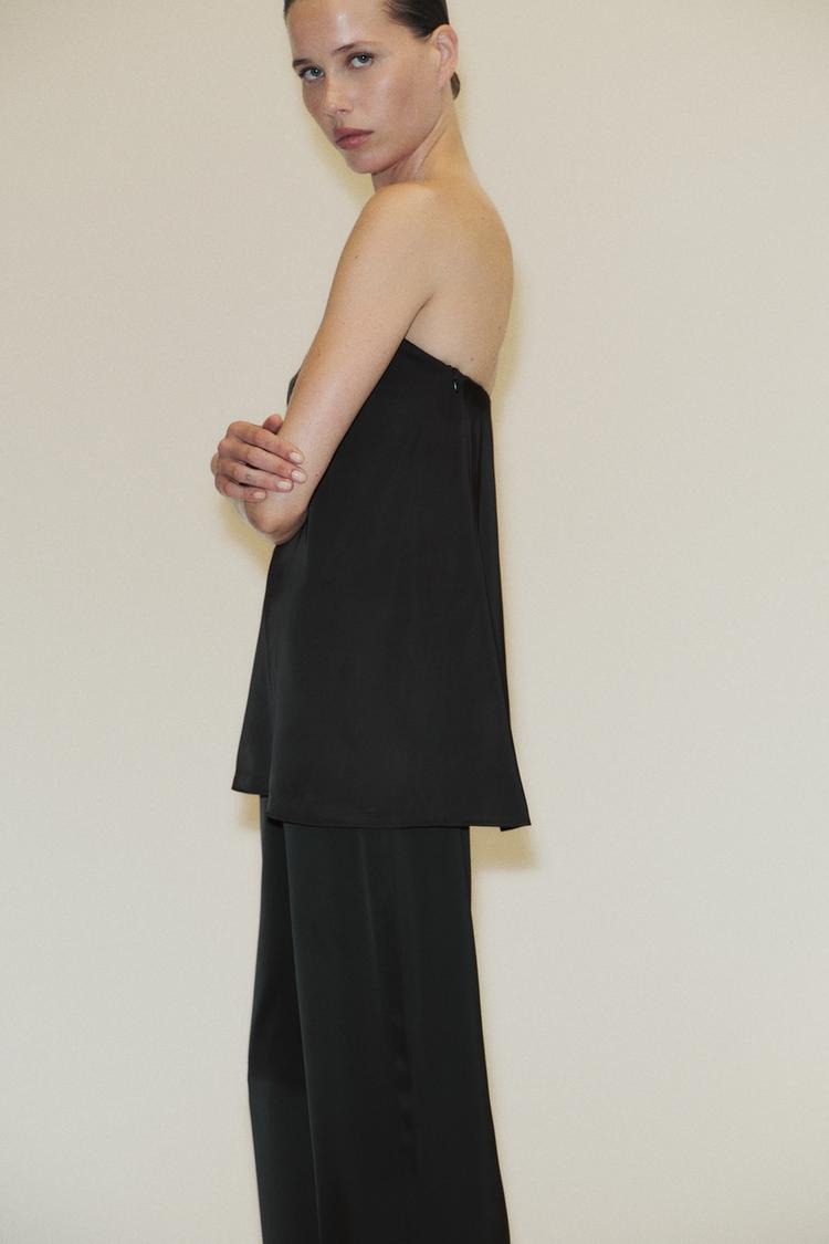 Chic et minimaliste, cet ensemble au fini satiné séduit par sa coupe épurée et son éclat subtil. Le haut présente un col droit et des épaules dénudées, avec un bandeau intérieur assorti pour un maintien discret. La fermeture zippée sur le côté est dissimulée dans la couture pour une finition soignée.