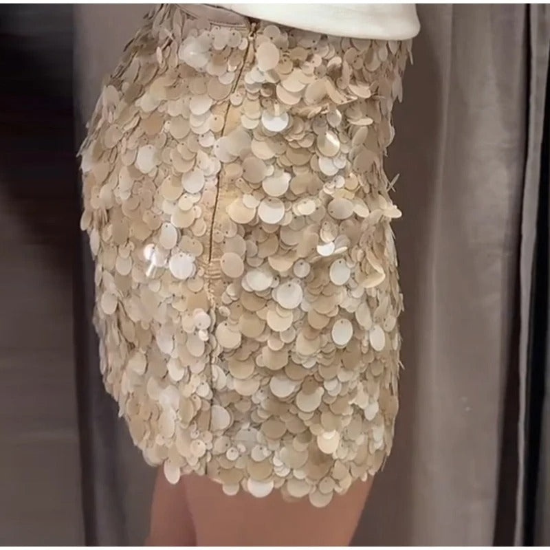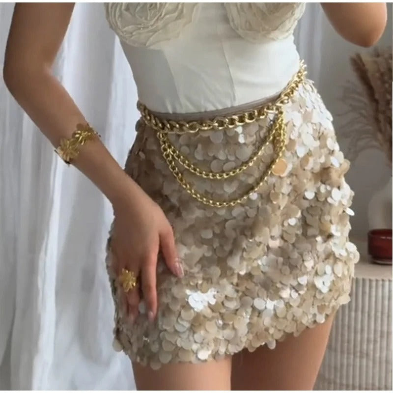 Le haut dos nu à encolure asymétrique dévoile les épaules avec subtilité, tandis que les fleurs 3D et les sequins captent la lumière à chaque mouvement. La mini-jupe assortie, ornée d’une fermeture zippée élégante, épouse les courbes avec justesse pour une silhouette affirmée et pleine de caractère.