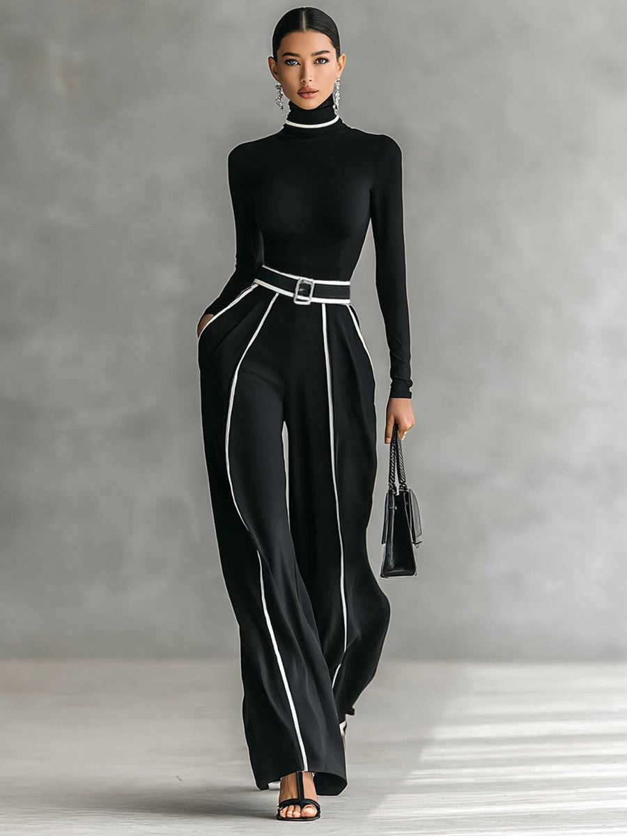 Ensemble, haut à manches longues et col roulé, pantalon large et ceinture
