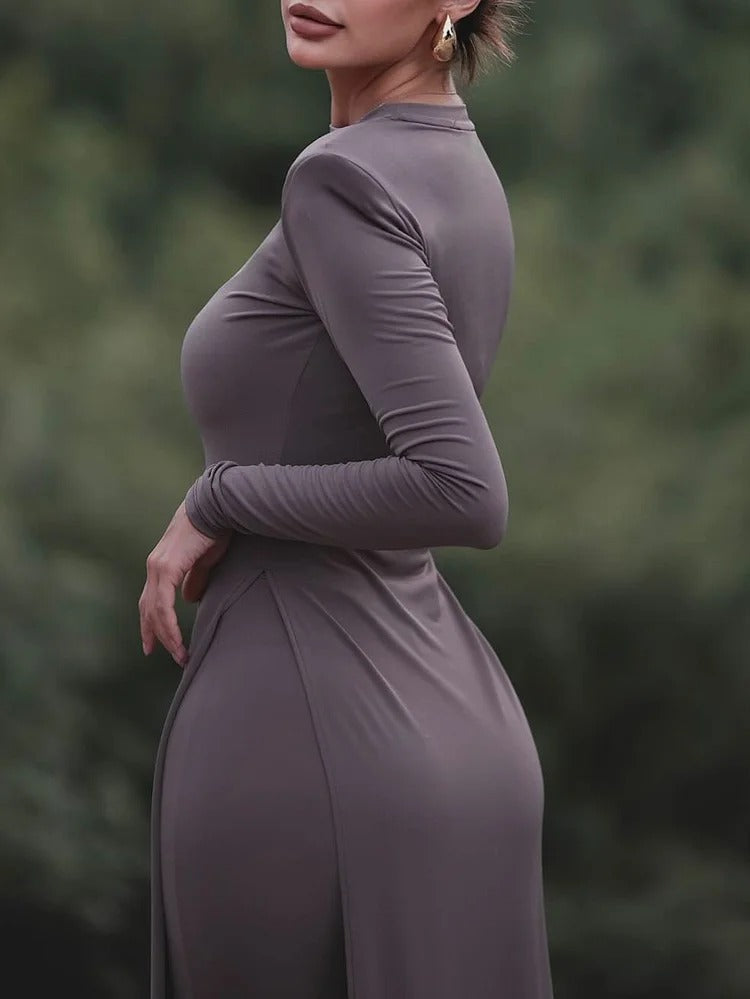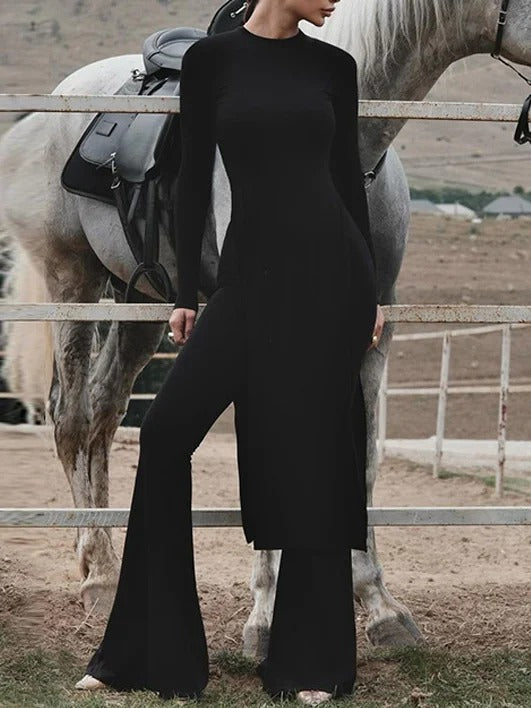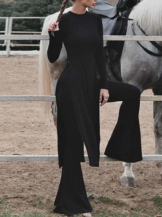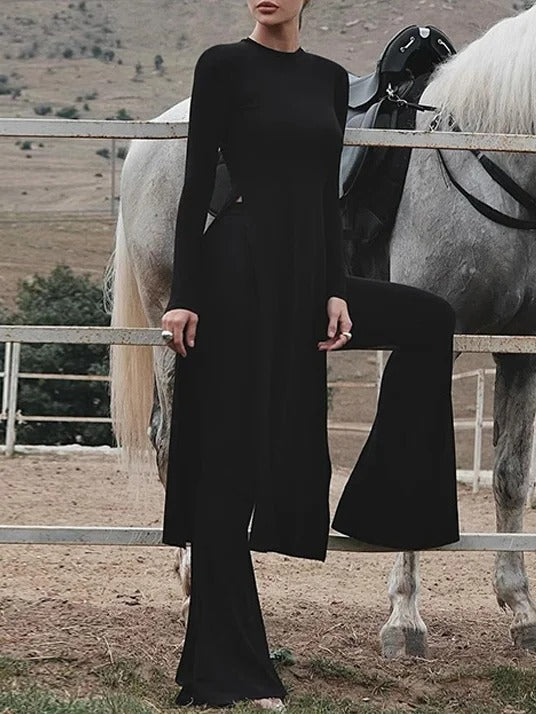Cet ensemble allie élégance et modernité avec un haut long fendu qui sublime la silhouette et un pantalon évasé moulant pour un effet allongeant. Idéal pour créer un look chic et sophistiqué, tout en restant confortable.