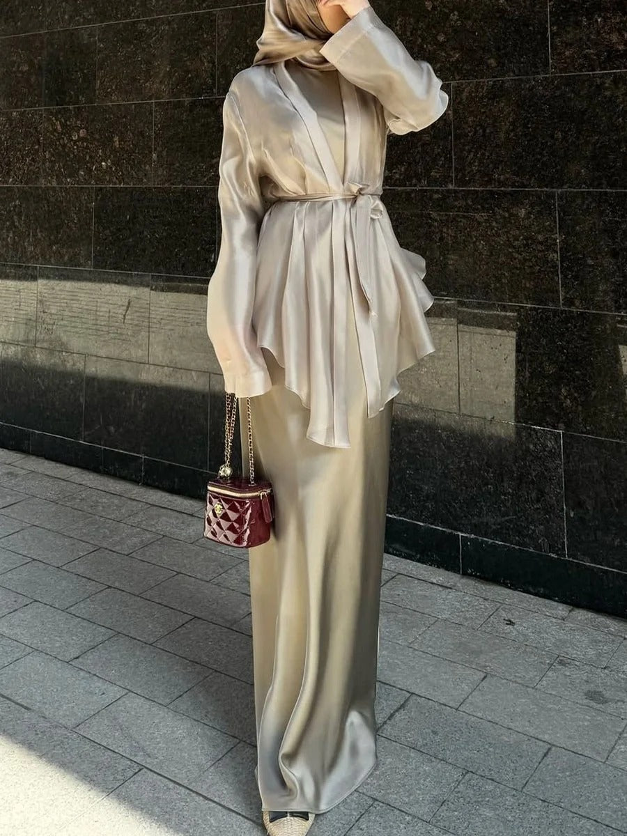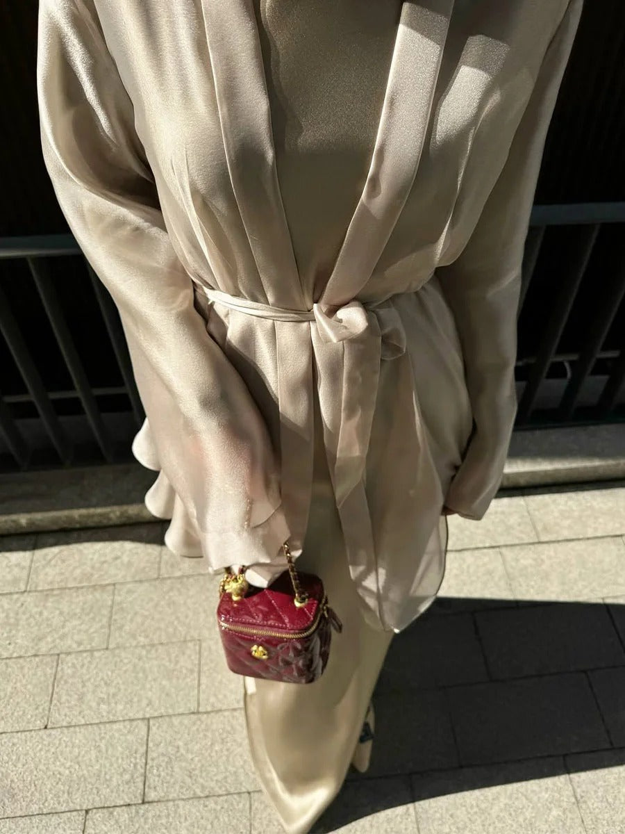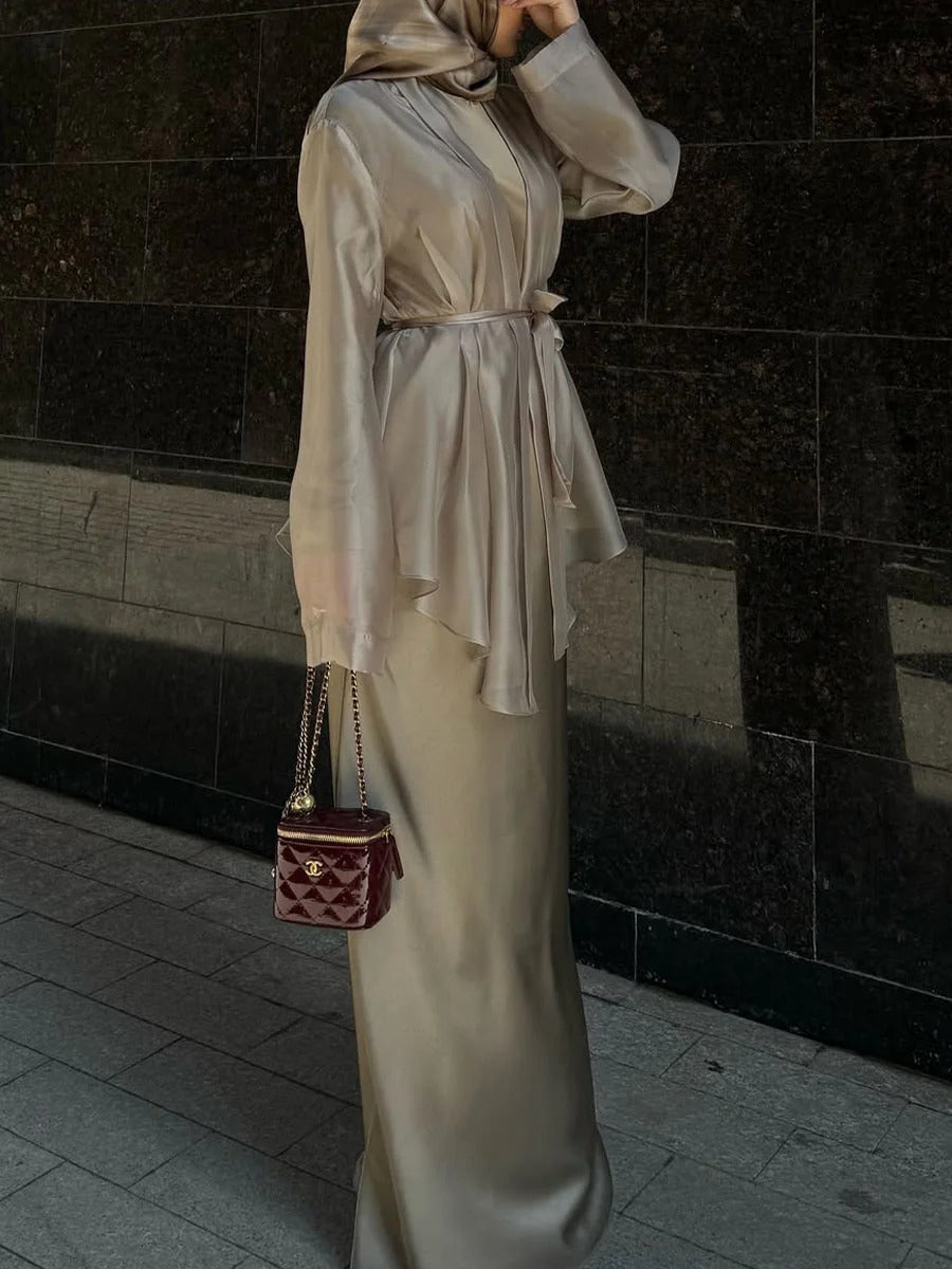 Cet ensemble kimono deux pièces allie élégance et confort pour un style raffiné au quotidien. Composé d'une robe fluide et d'un kimono assorti, il offre une silhouette gracieuse tout en restant pratique et légère. Idéal pour les occasions spéciales ou les sorties décontractées.