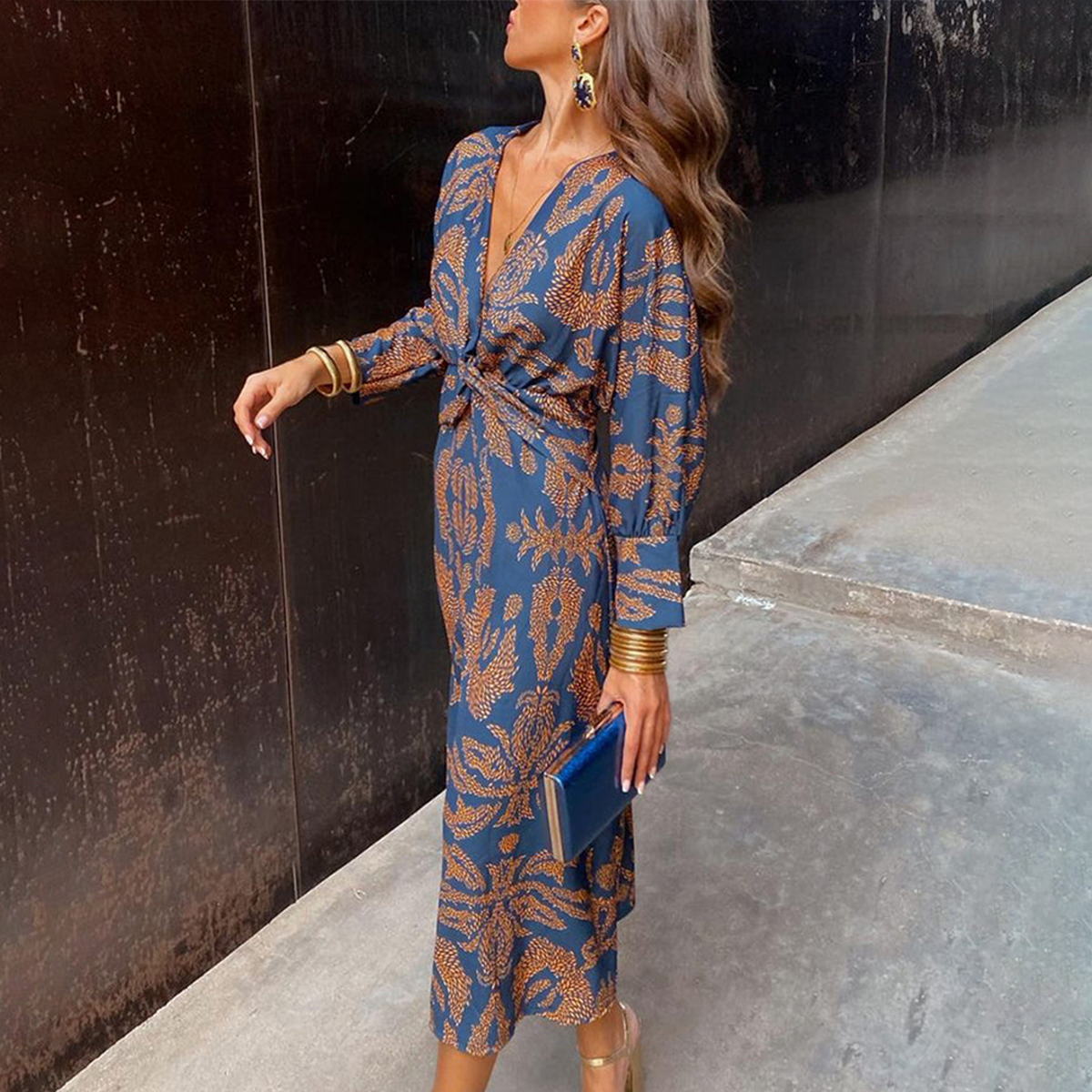 Robe midi Groovy bleue à manches longues