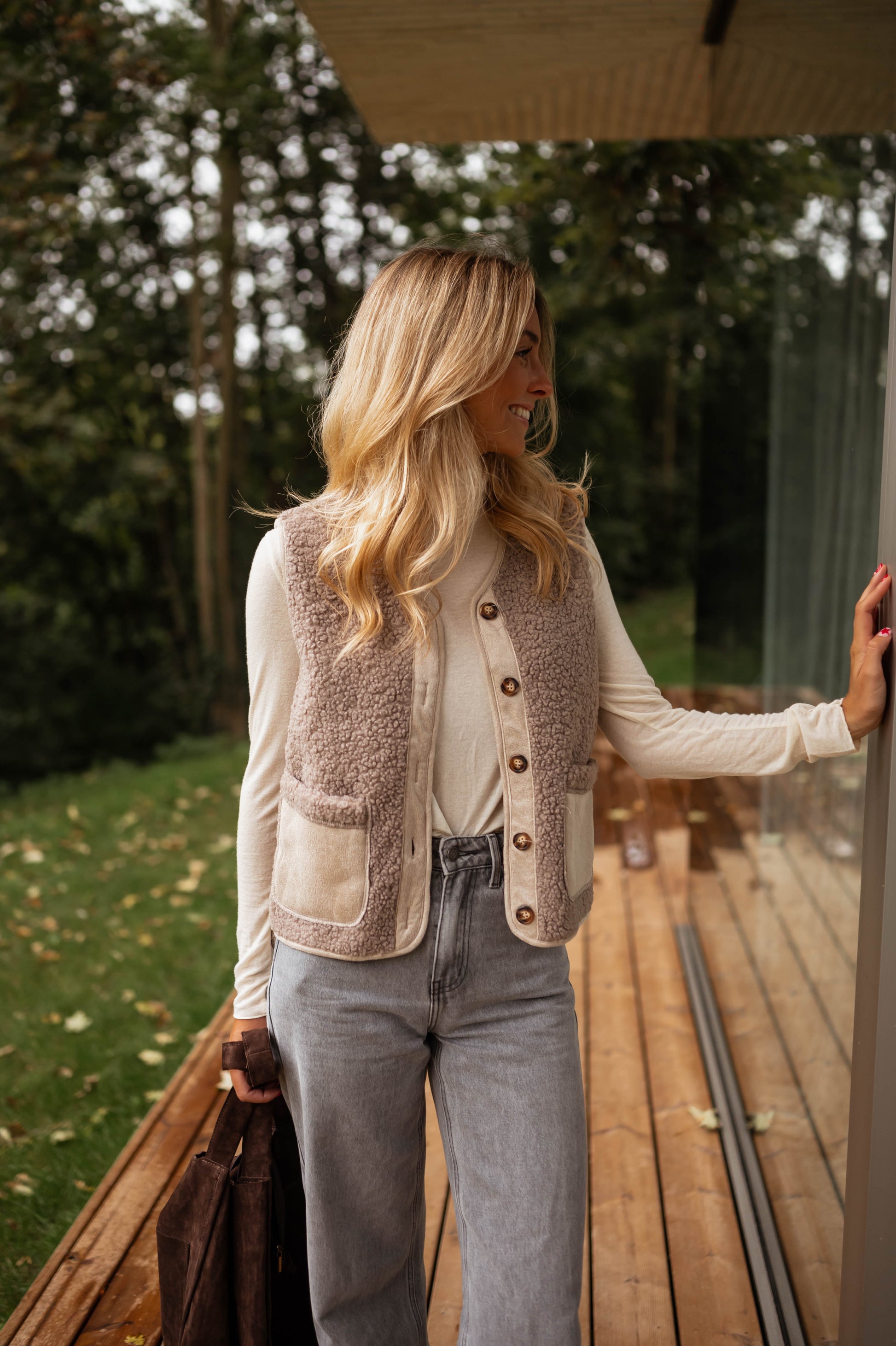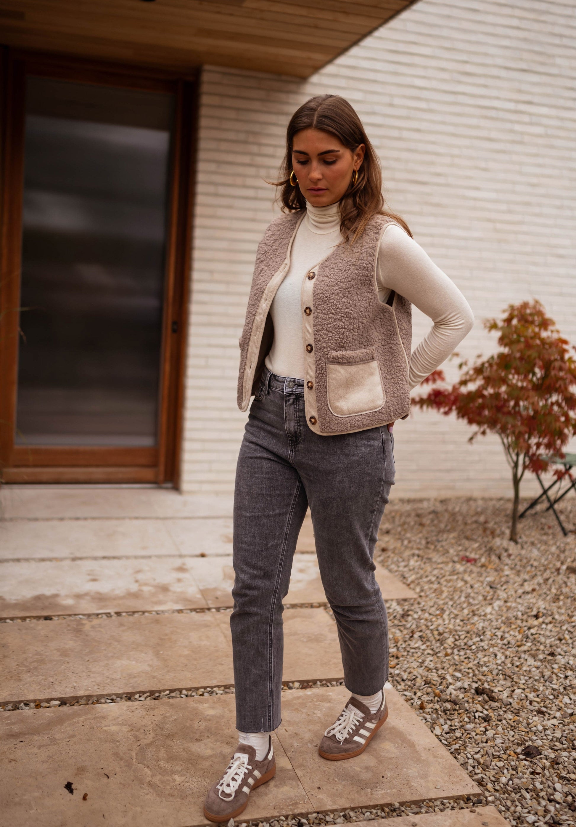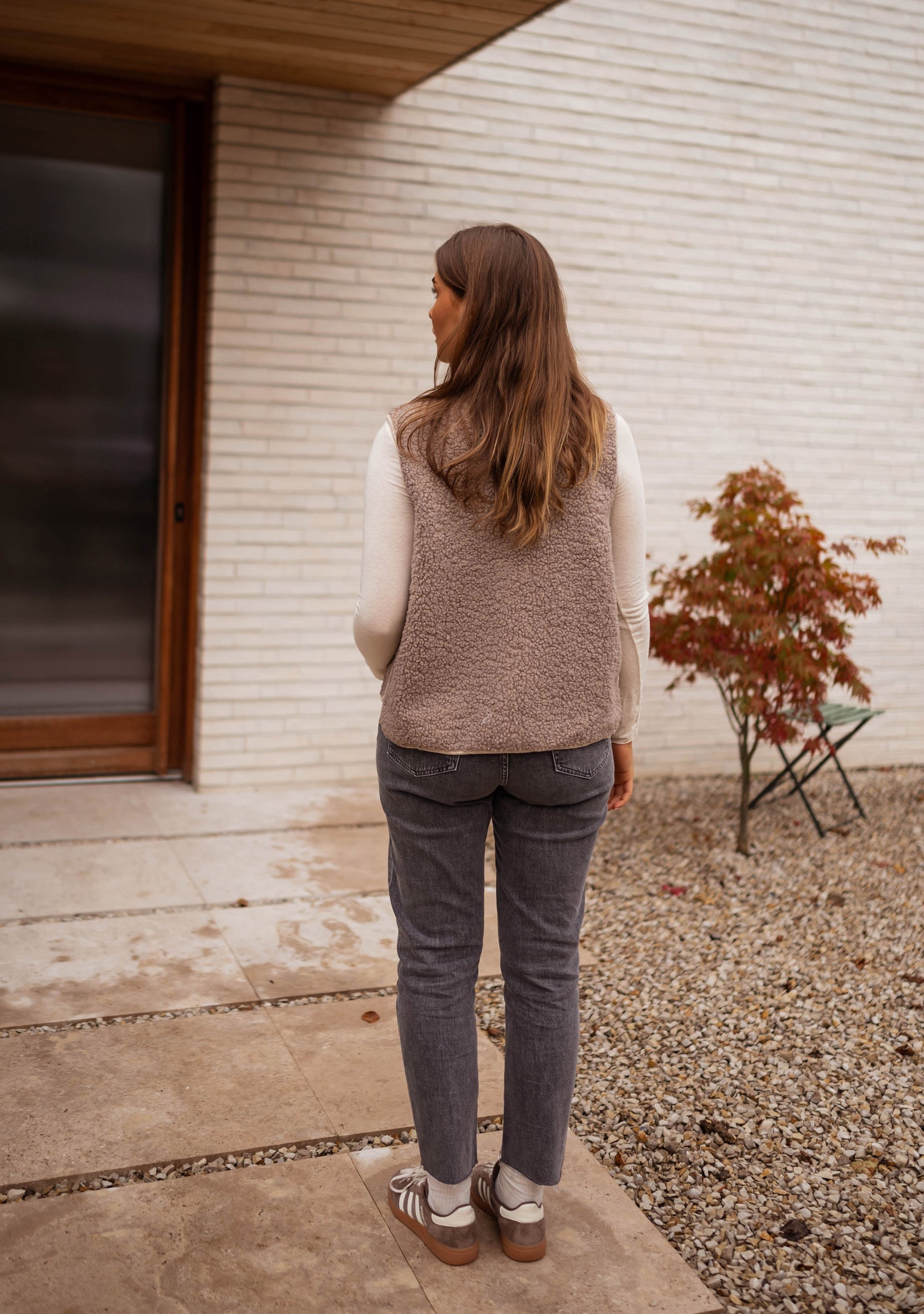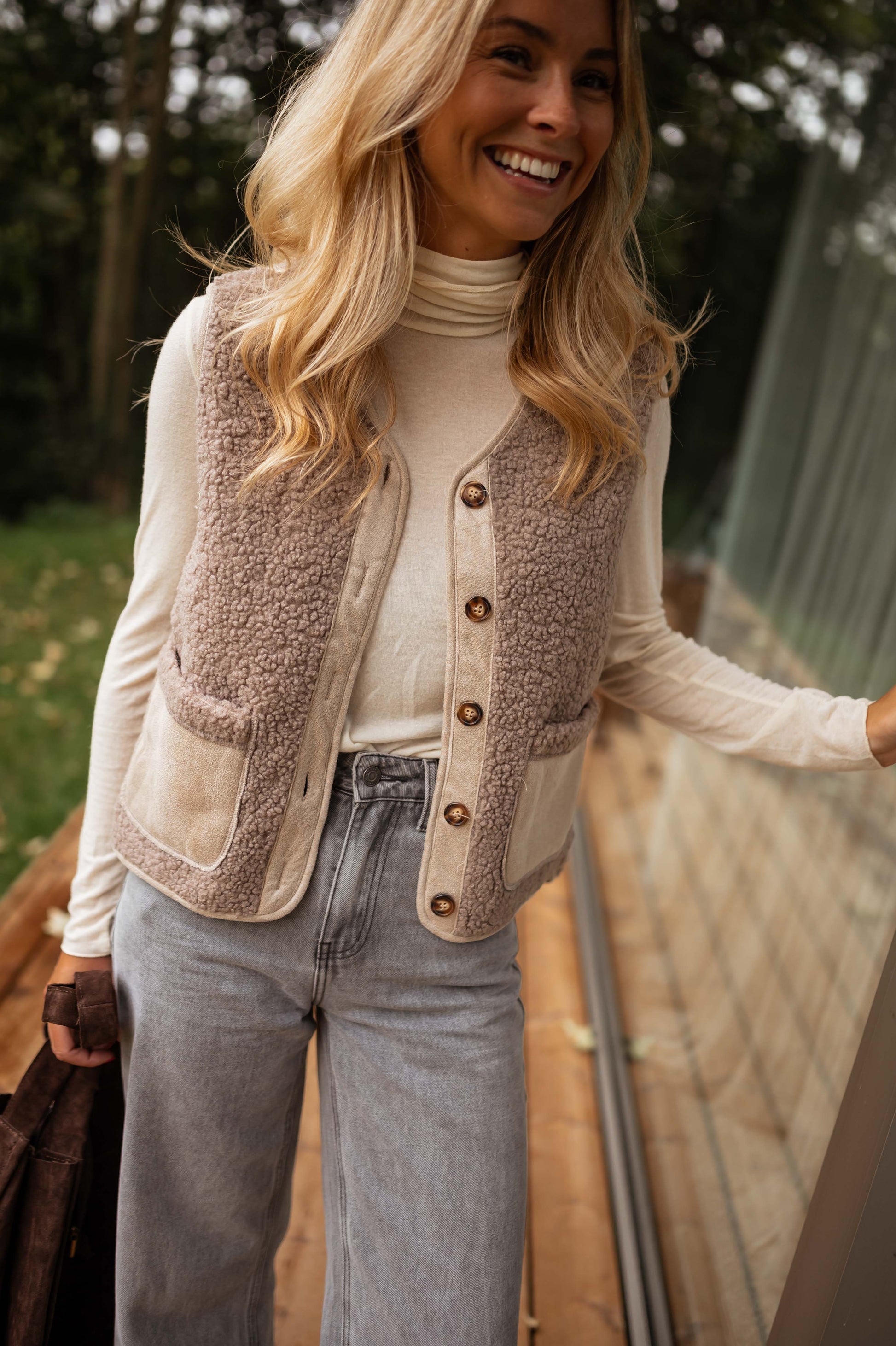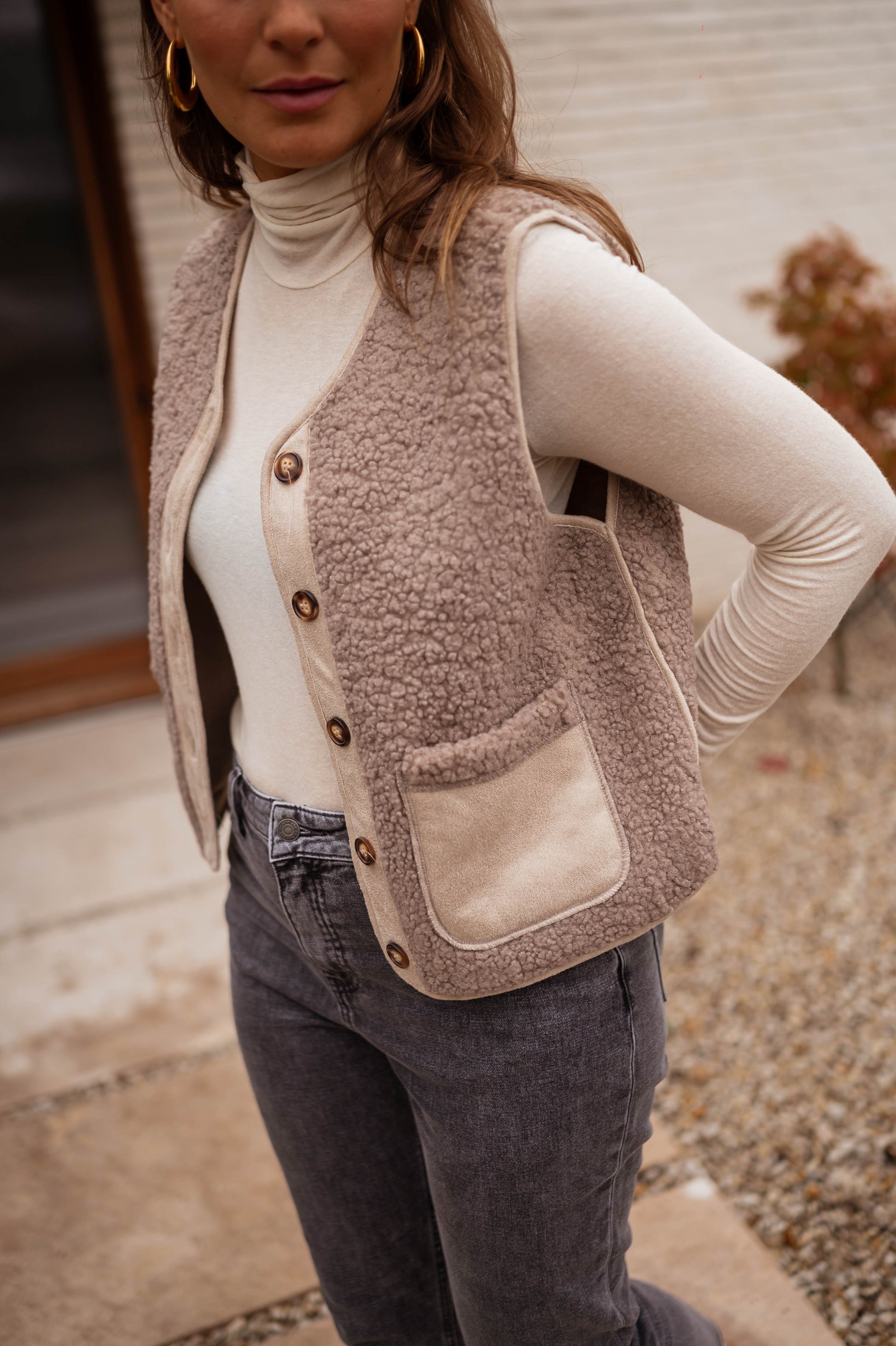 Ressentez la douce chaleur et l’élégance intemporelle en enfilant notre gilet Ghislain en taupe. Son tissu somptueux et sa coupe sophistiquée en font un indispensable pour toute femme au style raffiné.