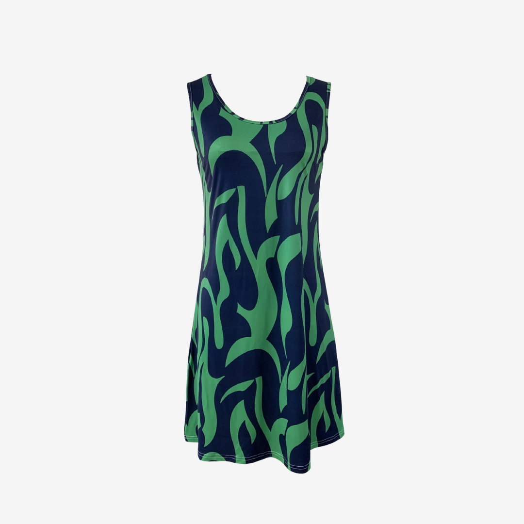 Adoptez un style estival audacieux avec la mini-robe sans manches Gioeira™. Ornée d'un imprimé abstrait vert et bleu marine saisissant, elle allie confort et style affirmé. Son tissu léger et fluide offre un drapé élégant, tandis que sa coupe trapèze décontractée assure une grande liberté de mouvement et une coupe flatteuse. Portée avec des sandales pour une promenade en bord de mer ou avec des accessoires pour une soirée, Gioeira™ est la pièce incontournable pour un look frais et moderne.
