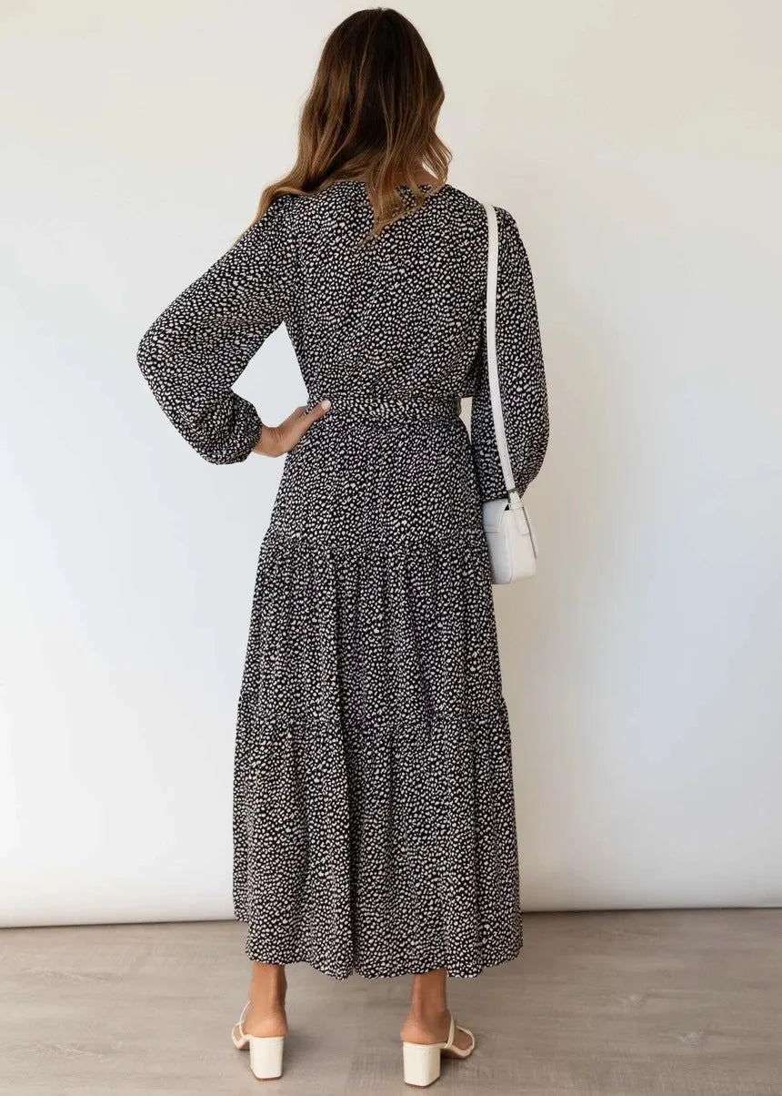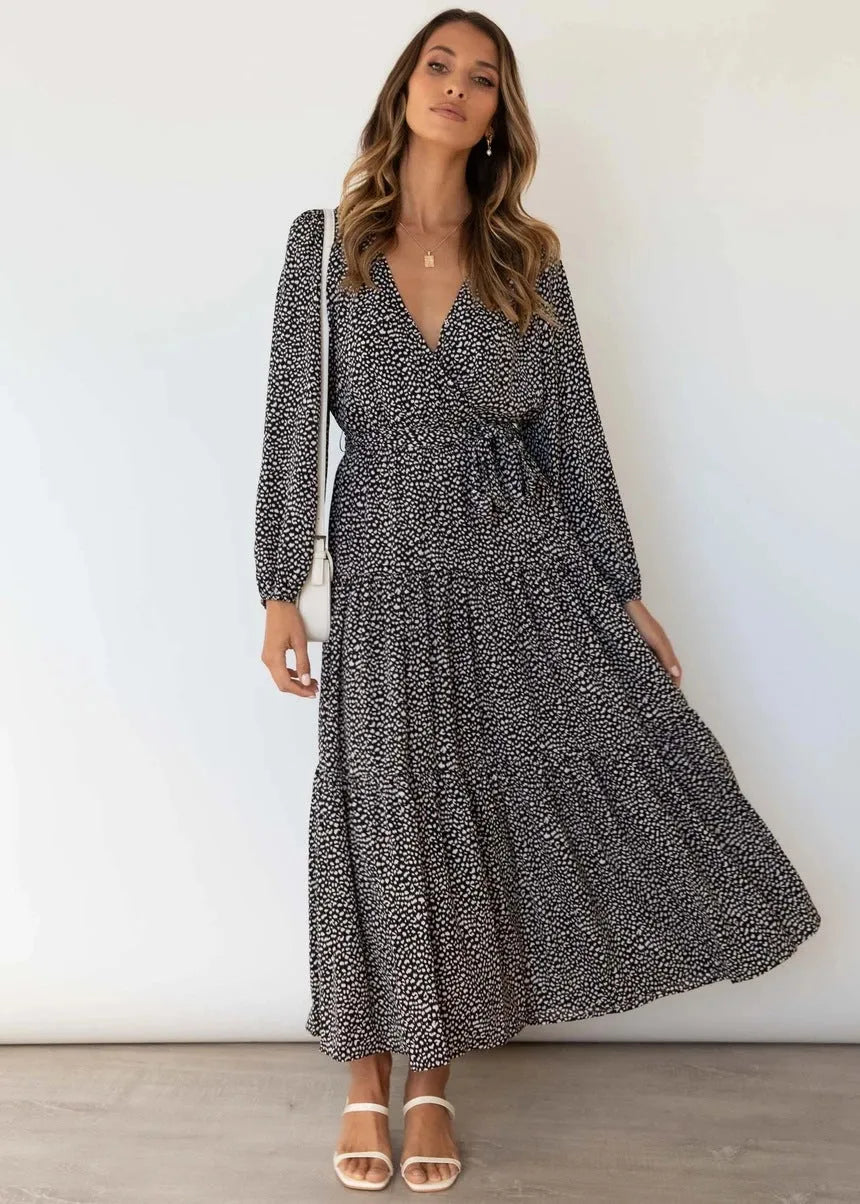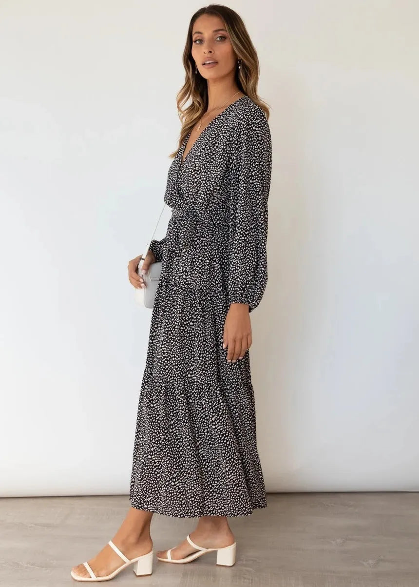 La robe longue à imprimé discret noir et blanc est un classique revisité avec élégance. Le décolleté en V profond et les manches longues ajoutent une touche de sophistication, idéale pour un look professionnel ou une soirée raffinée.