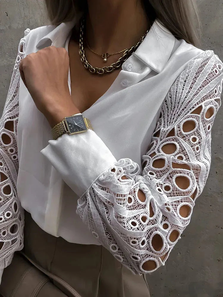 Adoptez l'élégance discrète avec cette blouse blanche satinée. Ses manches en dentelle ajourée dessinent une silhouette délicate et raffinée.