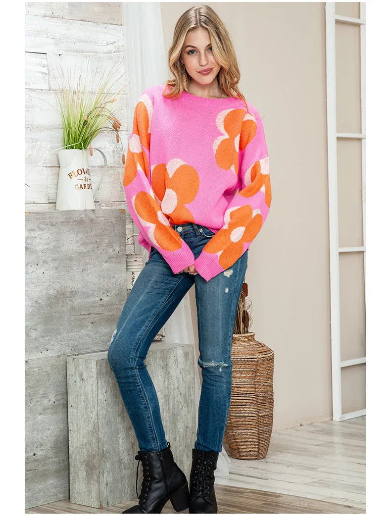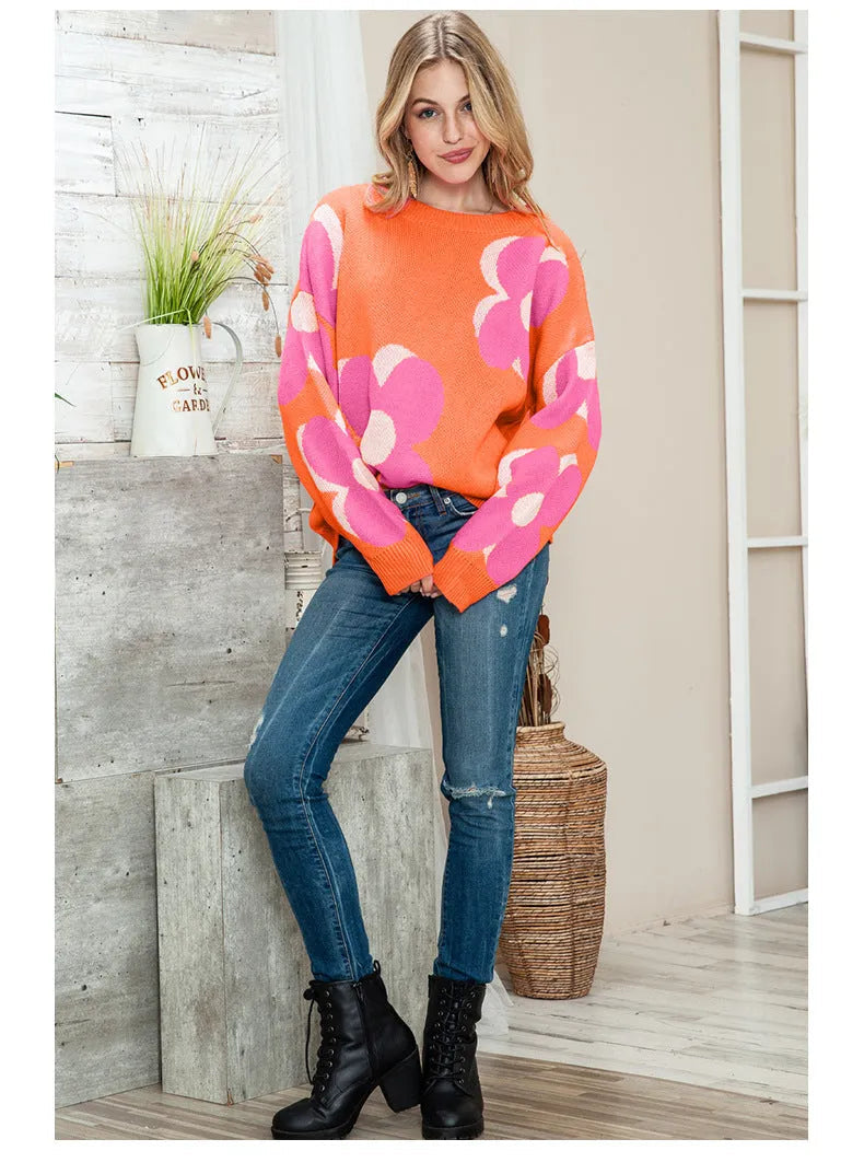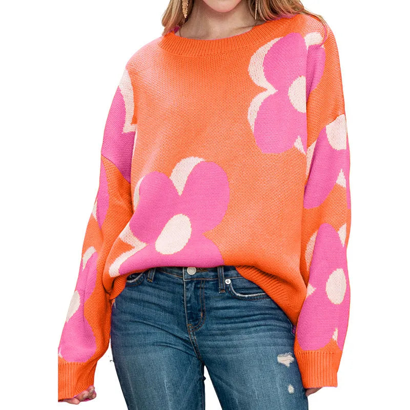 Orné de grandes fleurs roses, ce pull orange vif est une célébration de la joie et de la féminité. Il ajoute une touche de couleur audacieuse et un motif amusant à vos tenues d'hiver.
