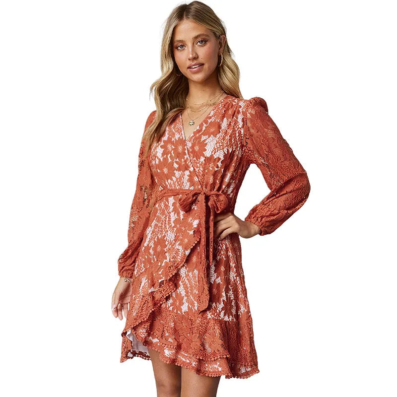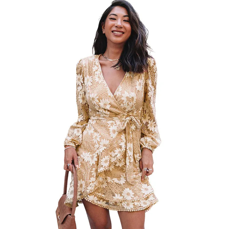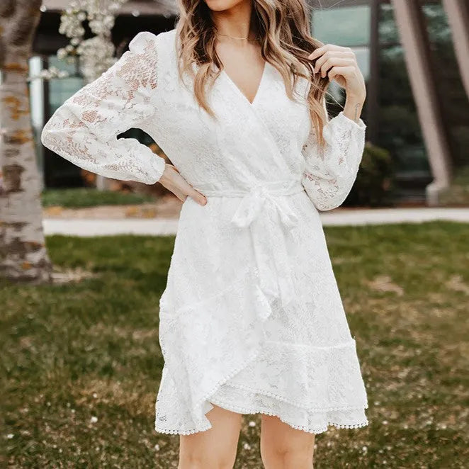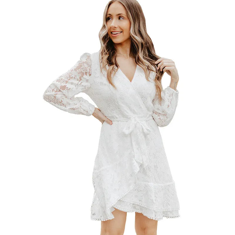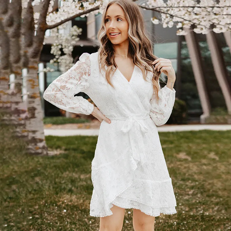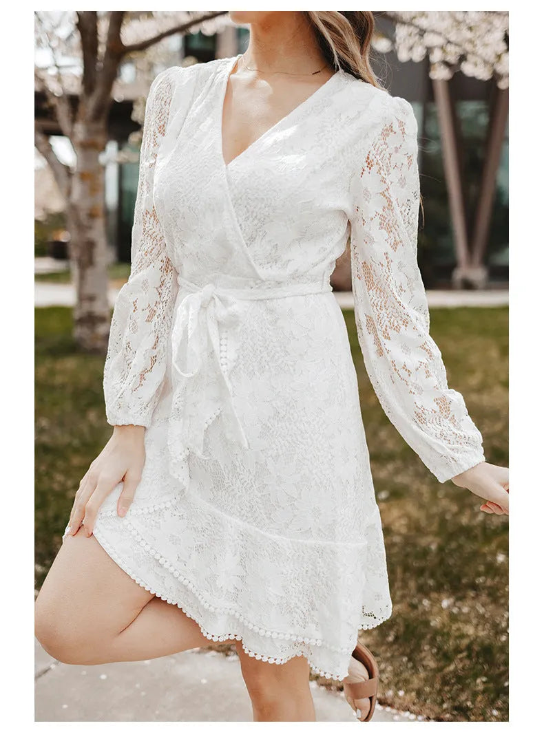 Rayonnez d'élégance et de grâce avec cette robe en dentelle blanche qui épouse parfaitement la silhouette féminine. Son décolleté en V et ses manches longues en dentelle ajoutent une touche de romantisme et de délicatesse. Parfaite pour une journée ensoleillée ou un événement chic en plein air, cette robe est la définition même de la légèreté et de la beauté.