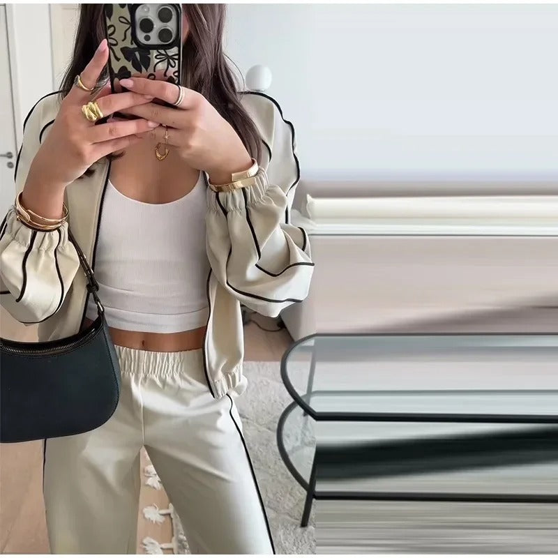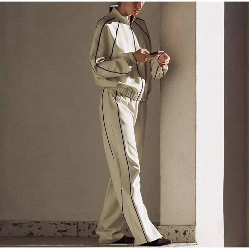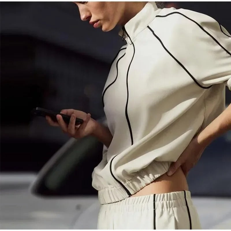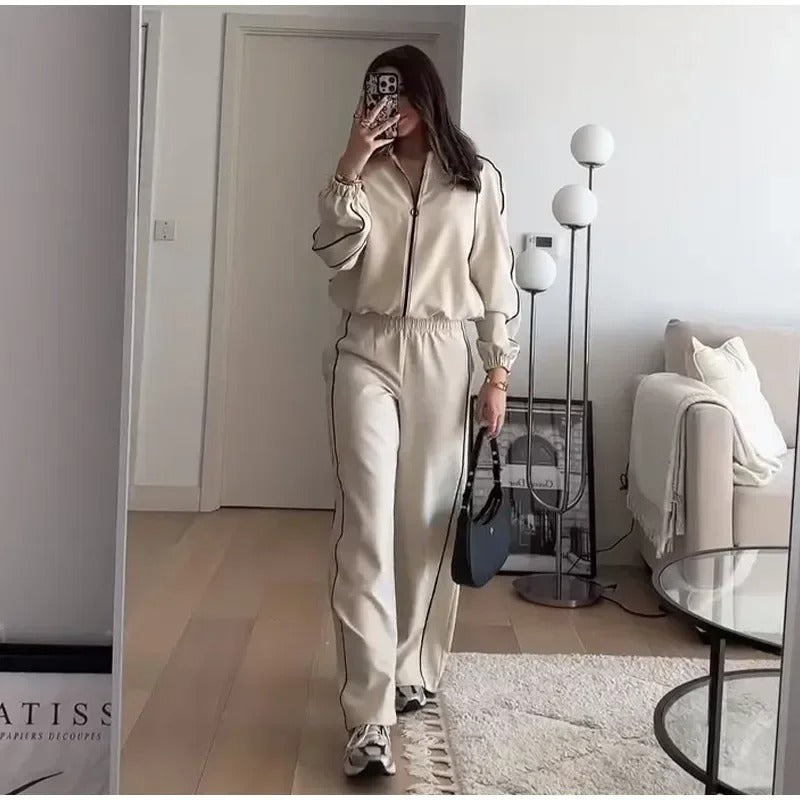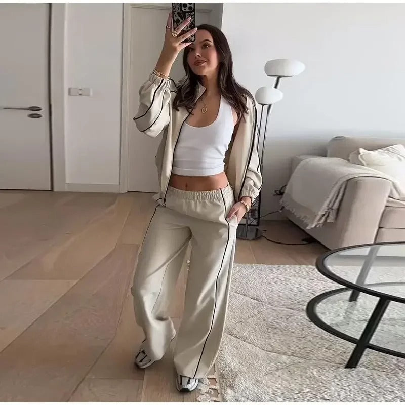 Conçu pour allier style sportif et élégance décontractée, cet ensemble à rayures se compose d’un manteau ample à manches longues et d’un pantalon large taille haute. Sa coupe fluide et ses finitions soignées en font une tenue confortable et tendance, idéale pour la mi-saison ou les journées actives.