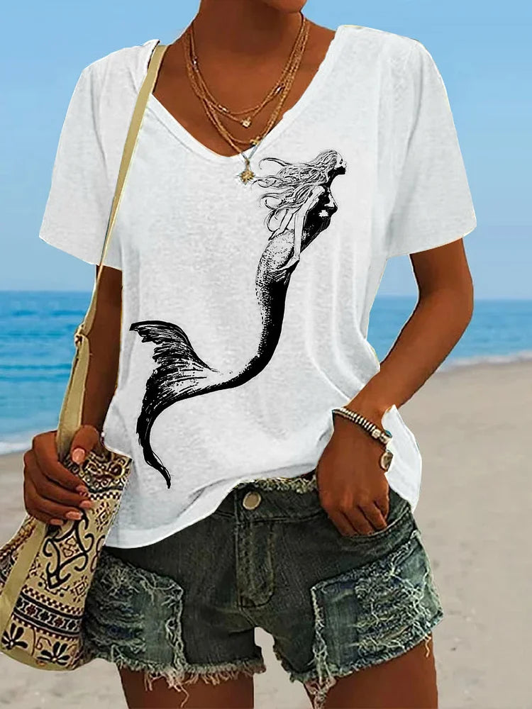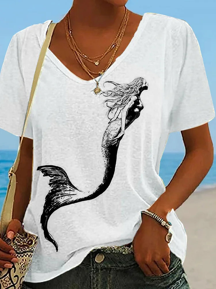 T-shirt à col en V à motif de croquis de sirène pour femmes