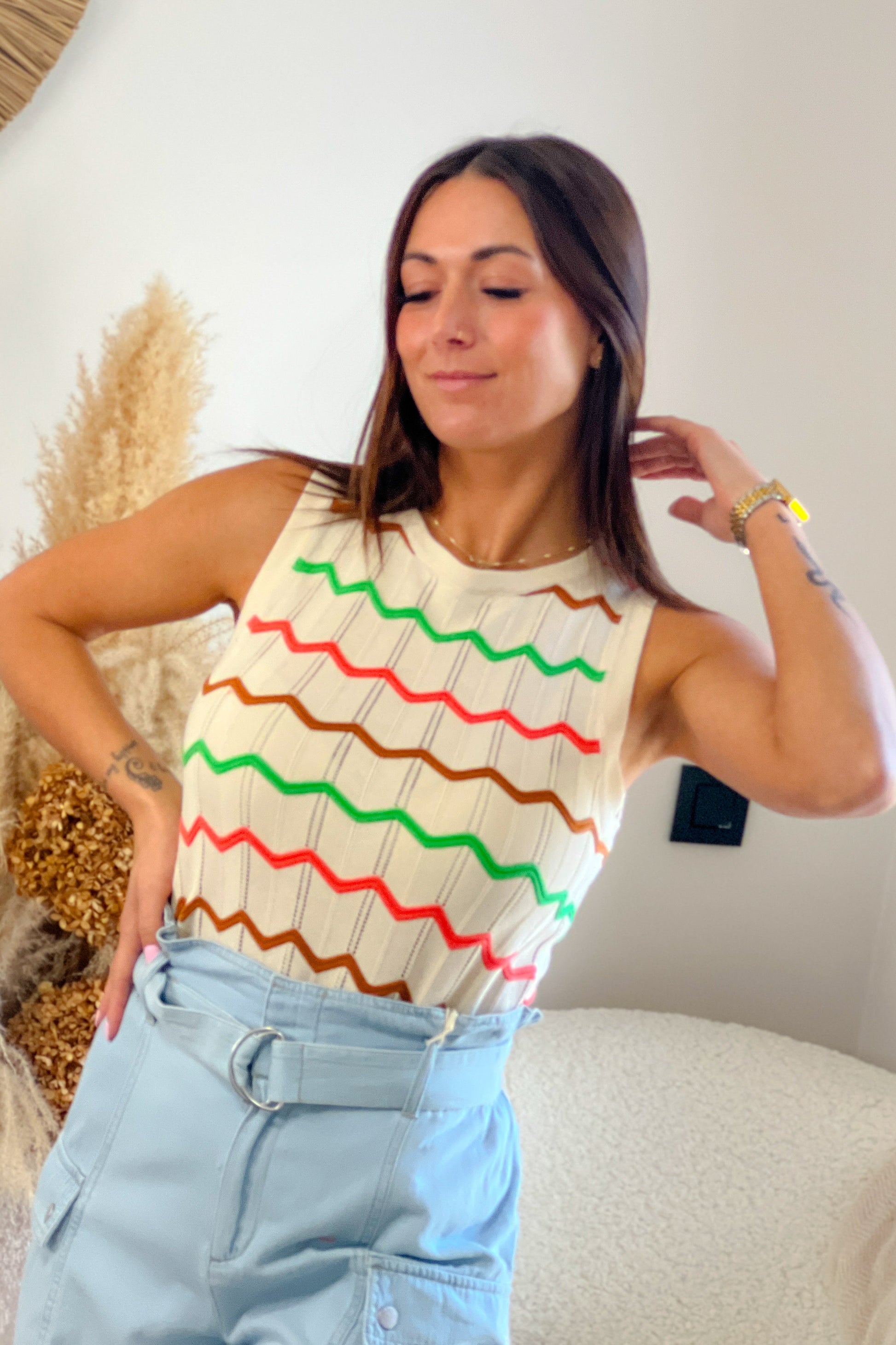 Pull à motifs. Un must-have pour l’été ! Ce pull a un col rond et une coupe régulière. Cet article est fait de 100% coton.
