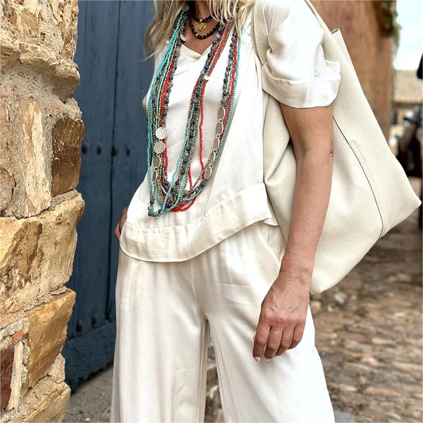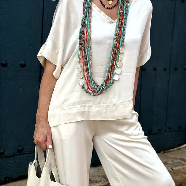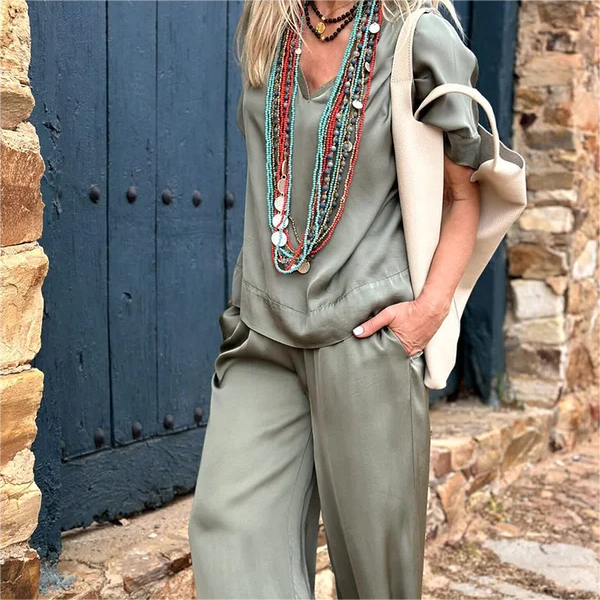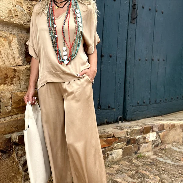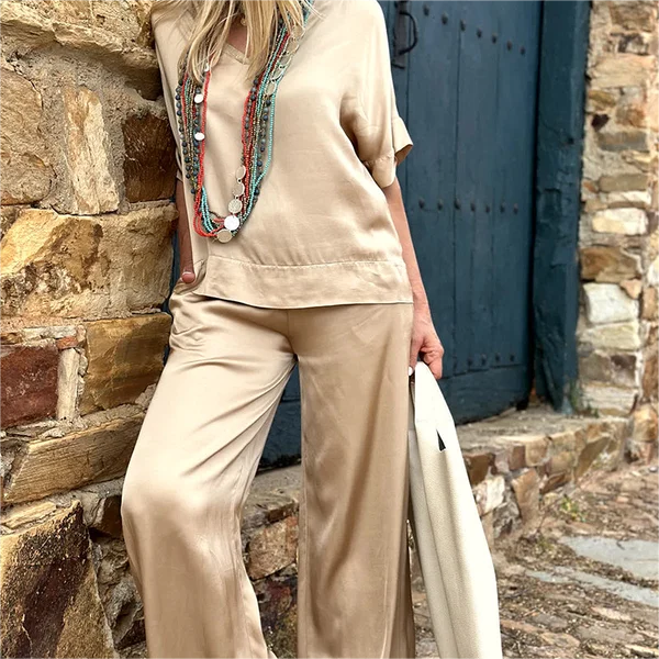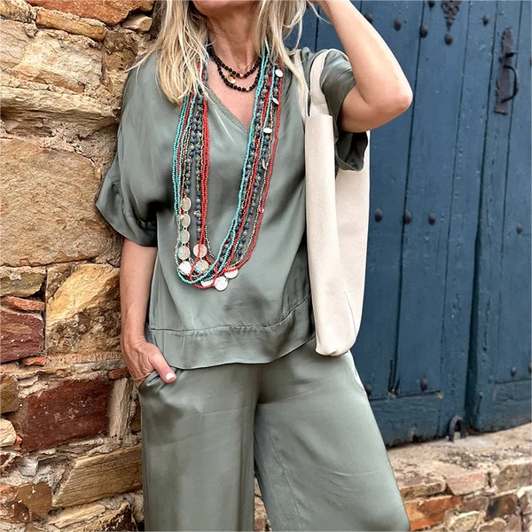 Ensemble deux pièces haut manches courtes col V + pantalon large