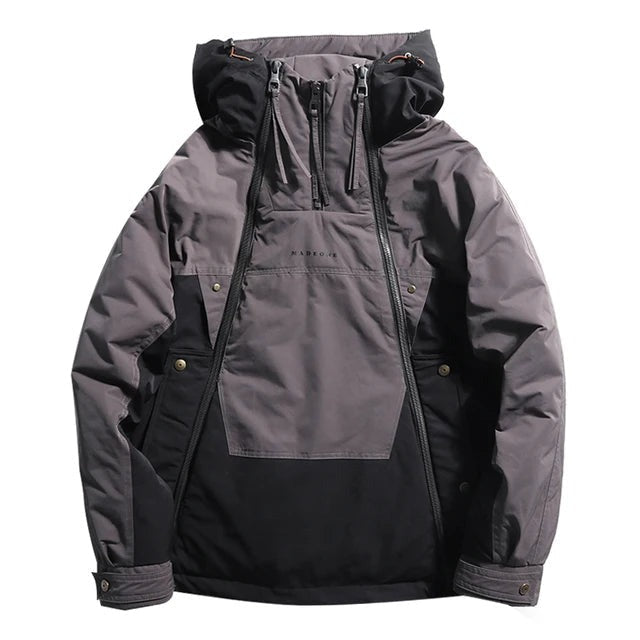 Une double fermeture éclair sur le devant permet une utilisation polyvalente, tandis que des poches multi-usages et des accessoires robustes ajoutent une touche pratique. Doublé de coton matelassé, il assure isolation et protection contre les intempéries.