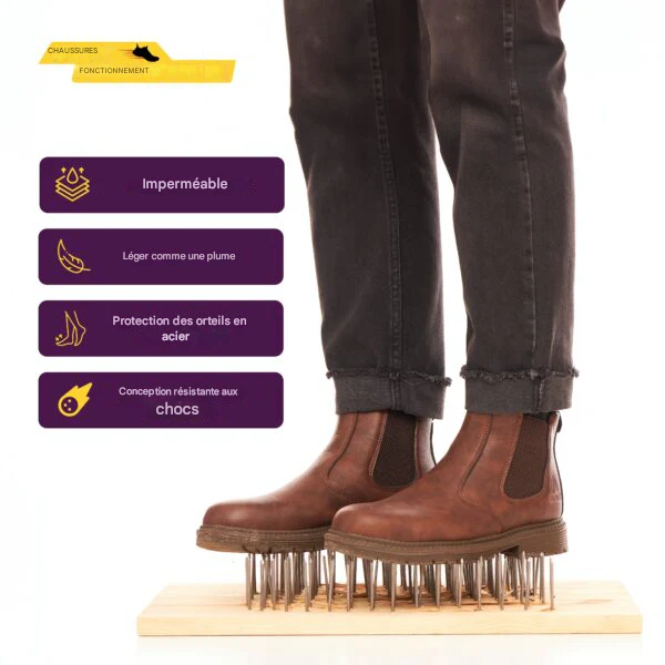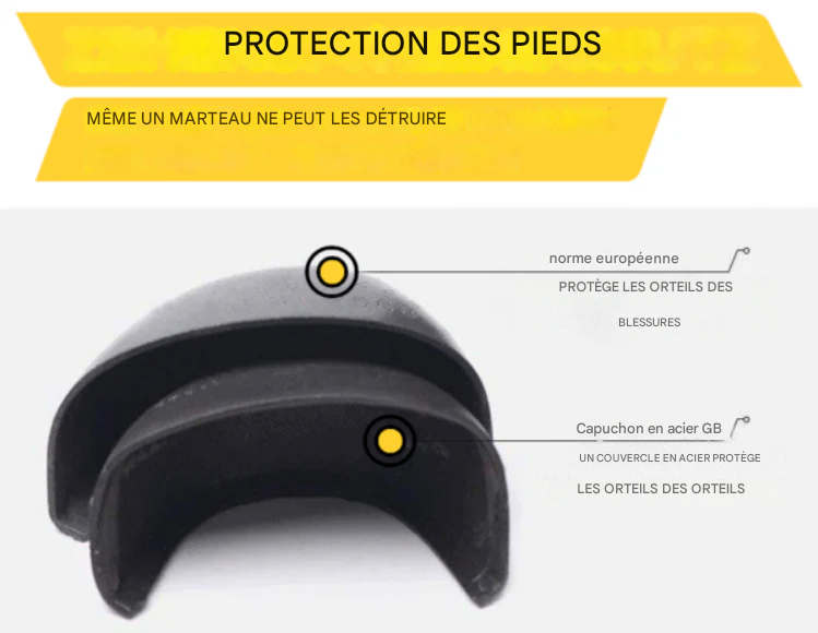 L'embout en acier peut résister à une pression allant jusqu'à 15 KN, protégeant vos pieds contre les objets lourds ou les chutes accidentelles. Cet embout, conforme aux normes européennes, offre suffisamment d'espace pour que vos orteils puissent bouger librement.